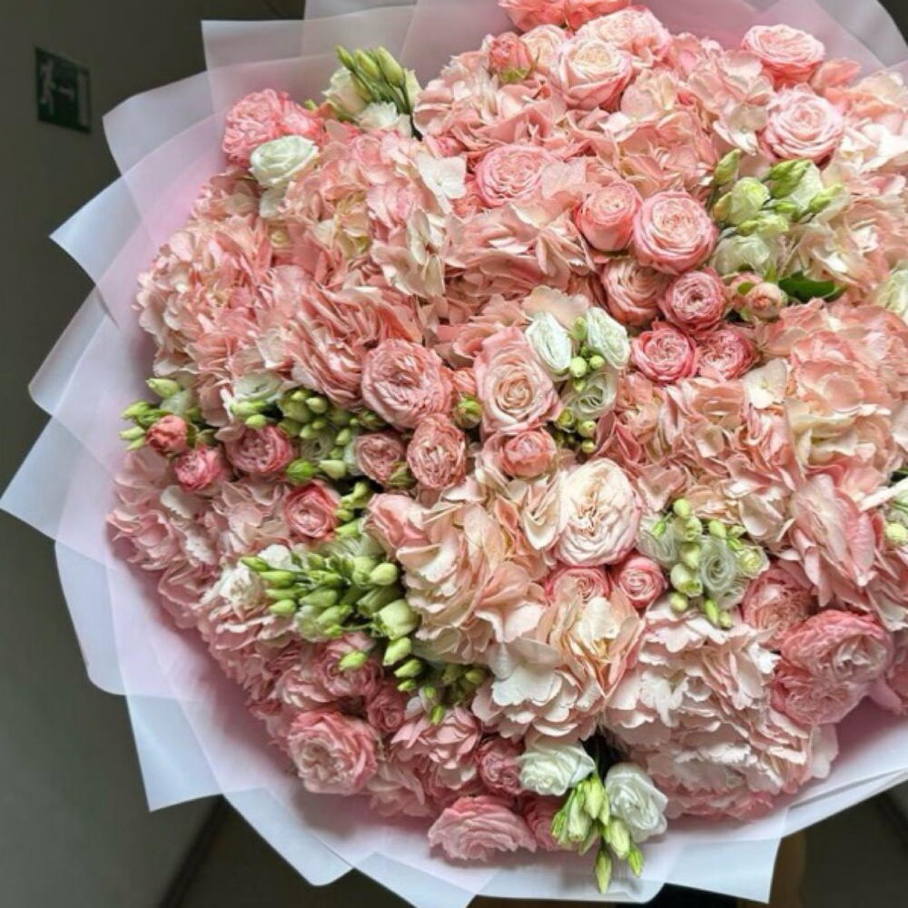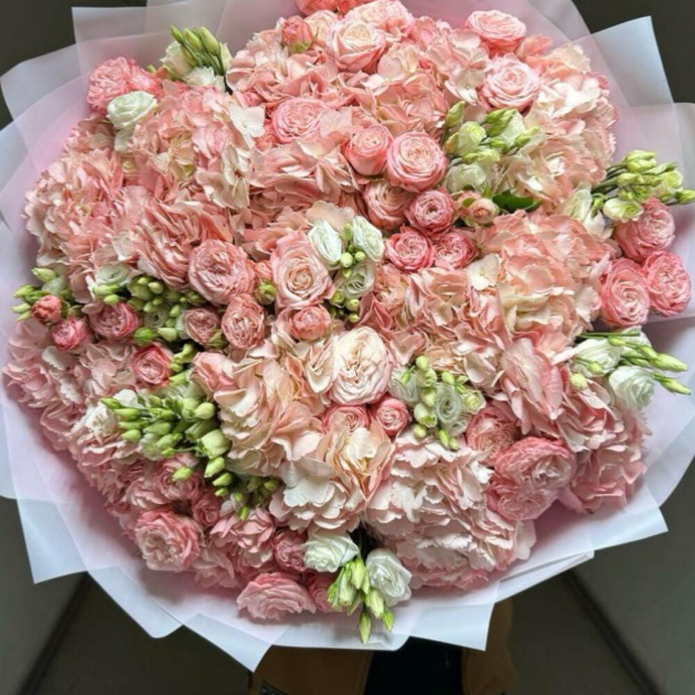 Гортензия - 15 шт. Лента атласная - 1 шт. эустома белая - 10 шт. Кустовая роза пионовидная - 10 шт. Дизайнерское оформление - 1 шт. букетная записка - 1 шт.