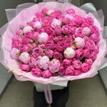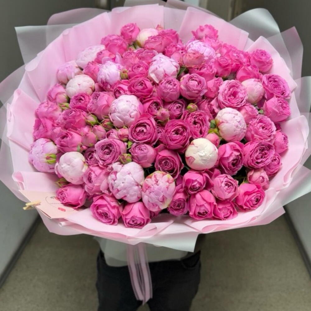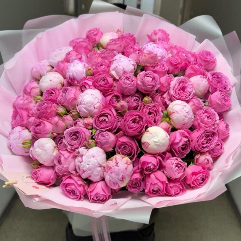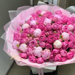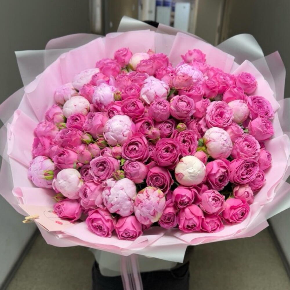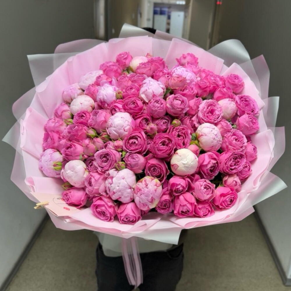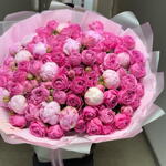 Лента атласная - 1 шт. Кустовая роза пионовидная - 20 шт. Дизайнерское оформление - 1 шт. пионы сара бернар - 15 шт. букетная записка - 1 шт.