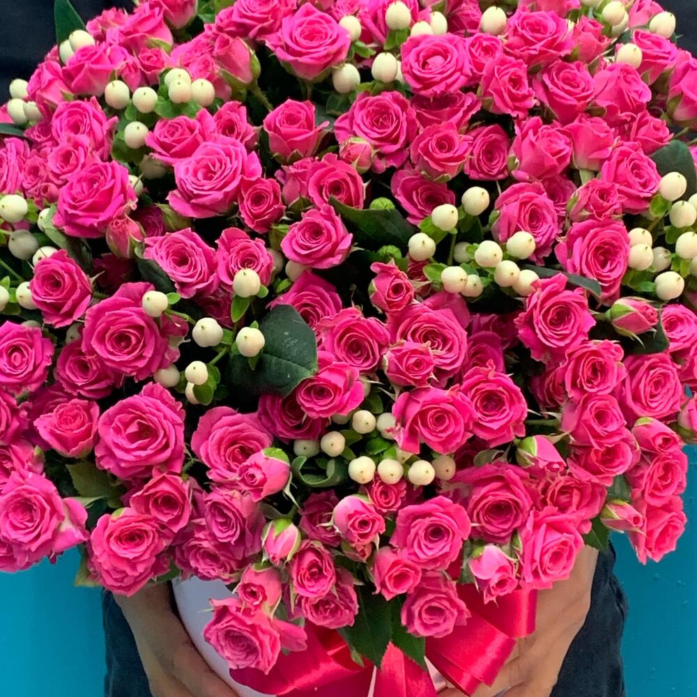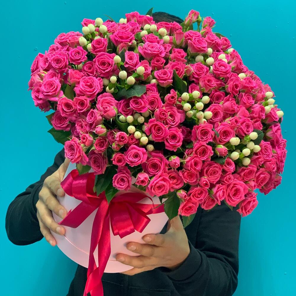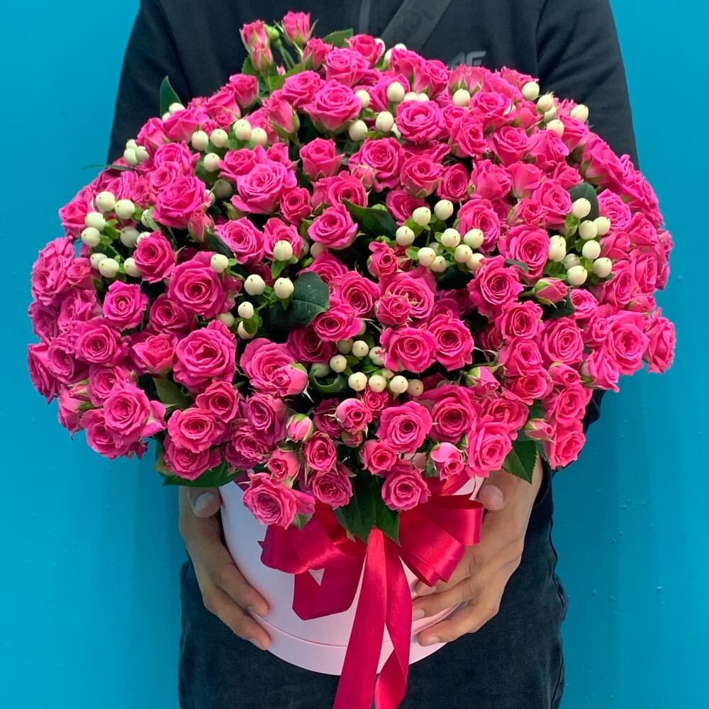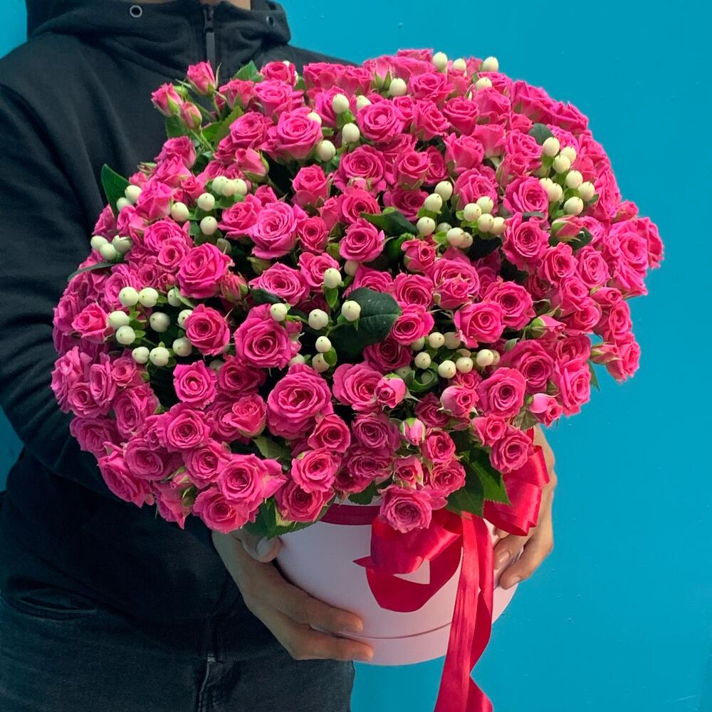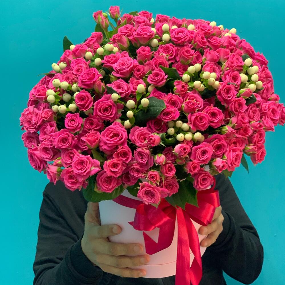 Гиперикум - 10 шт. Лента атласная - 1 шт. Шляпная коробка - 1 шт. Кустовая роза малиновая - 51 шт. Флористическая губка (оазис) - 3 шт.