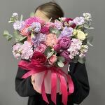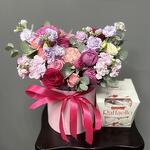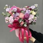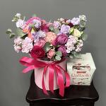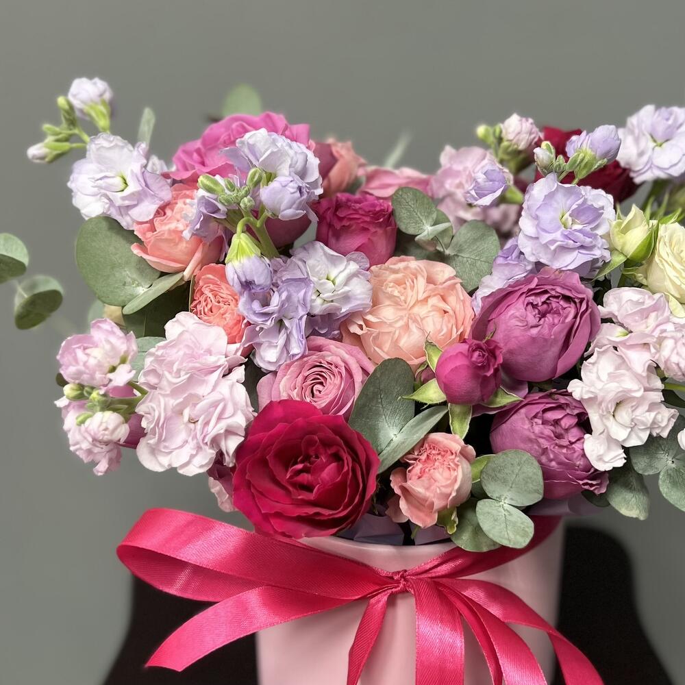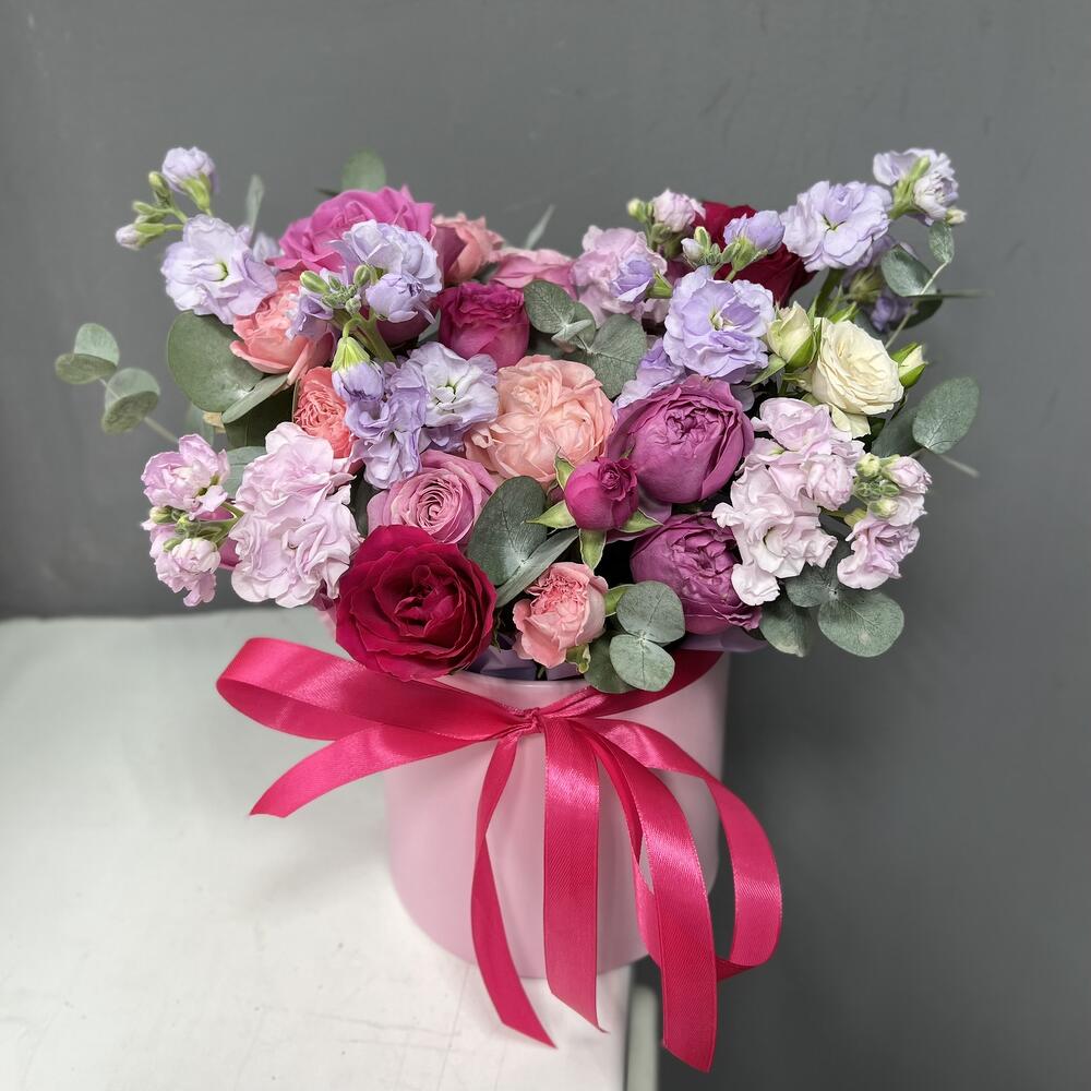 Кустовые пионовидные розы, диантусы, маттиола и эвкалипт в шляпной коробке (000200050004) (002022)