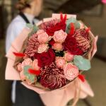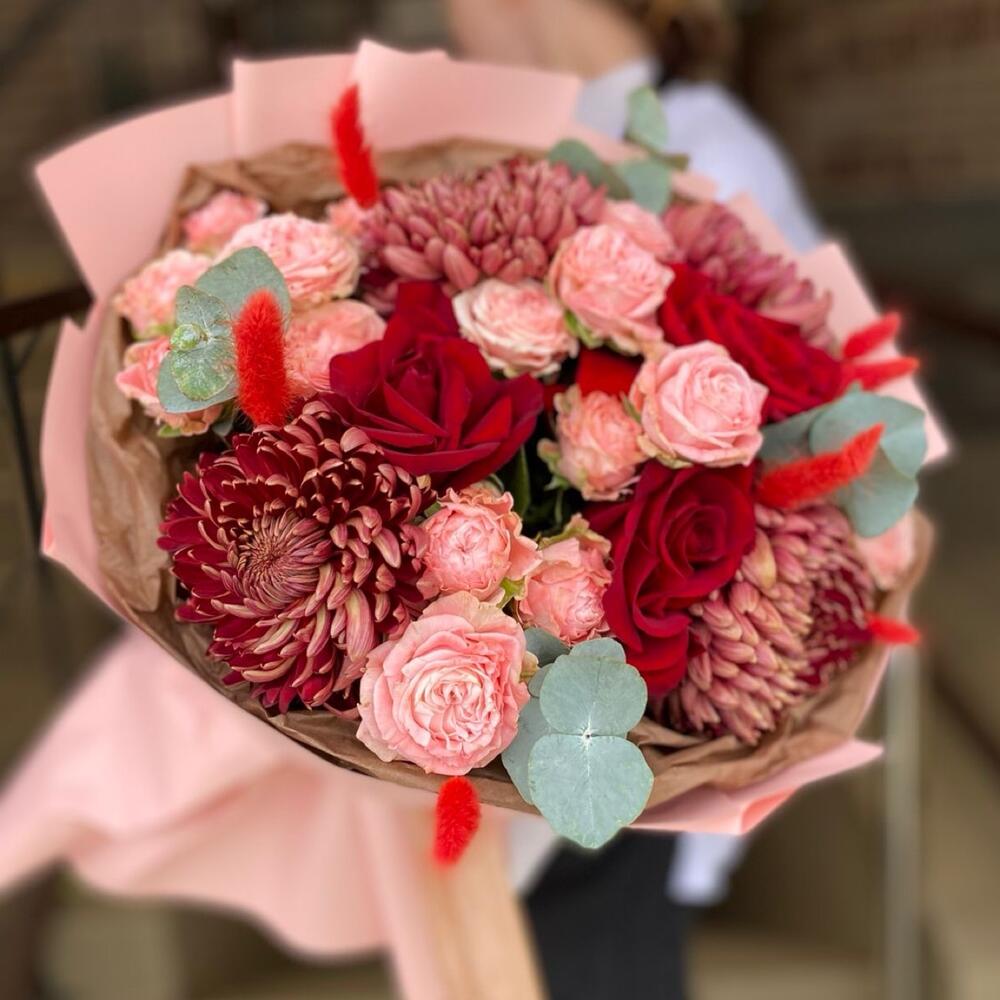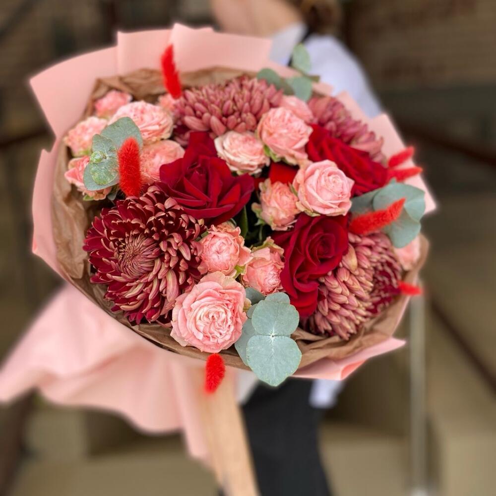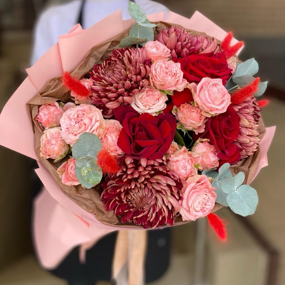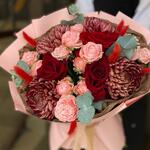 Хризантема кустовая - 4 шт. Роза - 3 шт. Кустовая роза - 4 шт. Упаковка дизайнерская - 6 шт. Лагурус - 5 шт. Эвкалипт Микс - 5 шт.