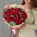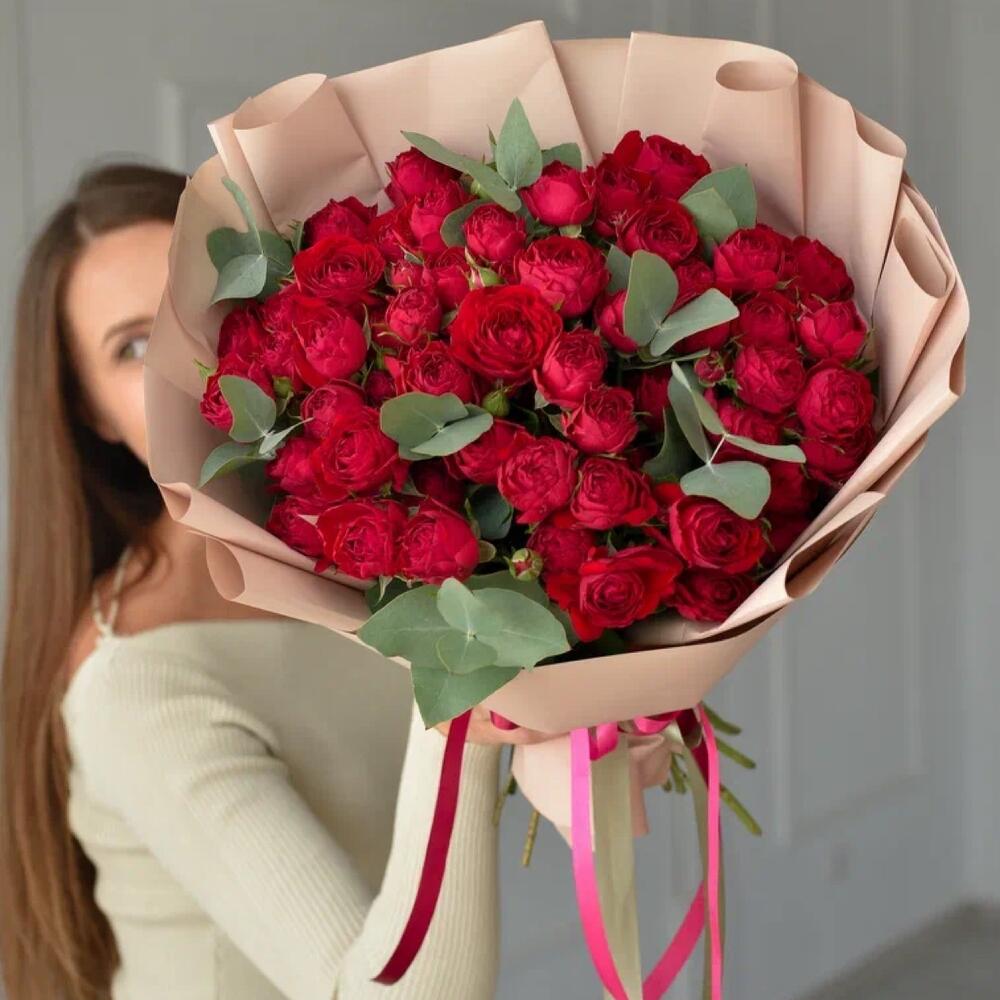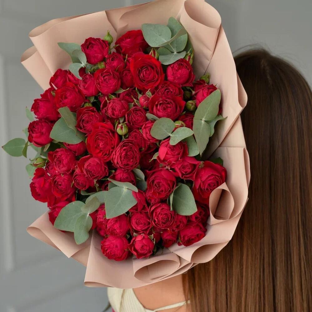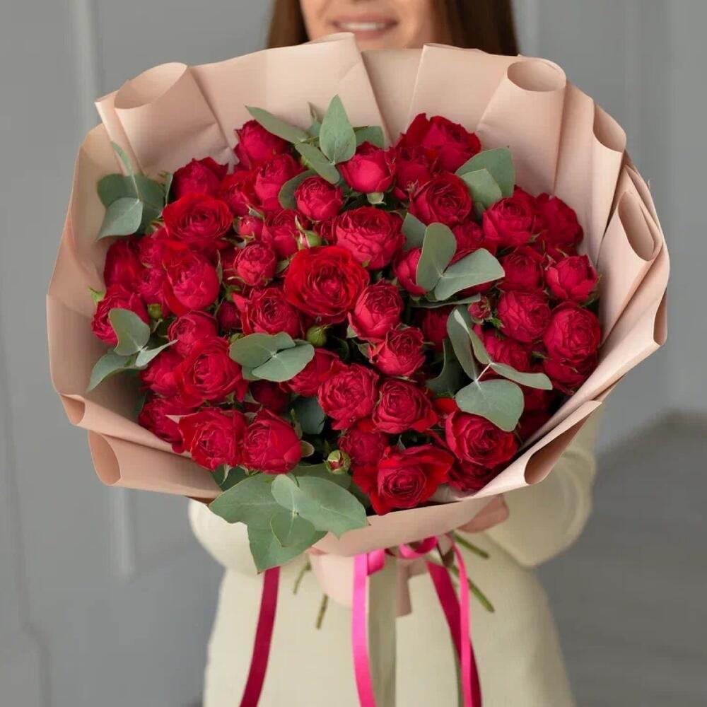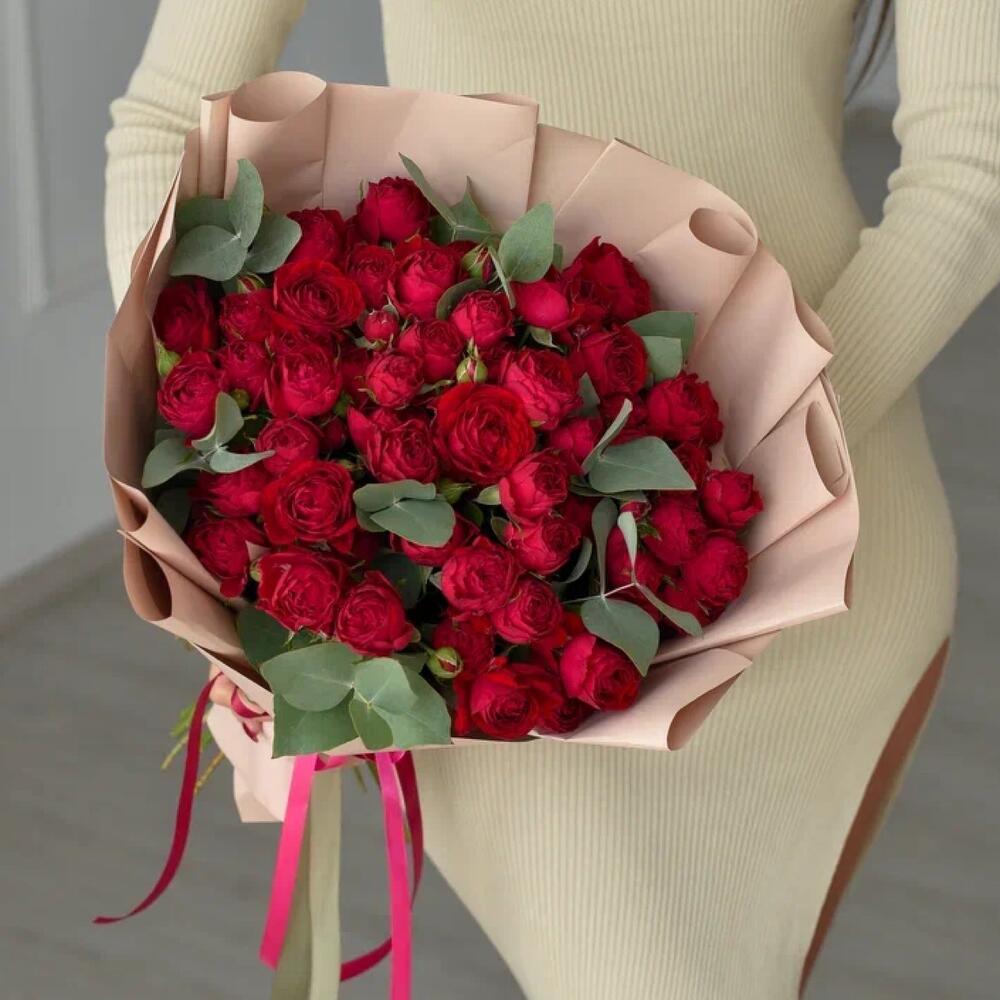 Эвкалипт - 3 шт. Атласная лента - 2 шт. Пленка матовая - 3 шт. ред баблс кустовая роза - 15 шт.