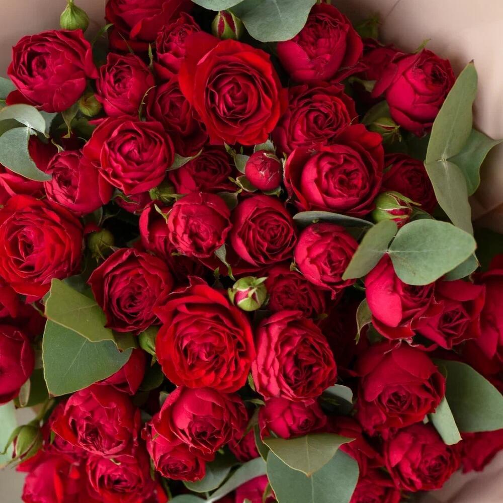 Кустовые розы Ред Баблс с эвкалиптом