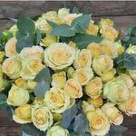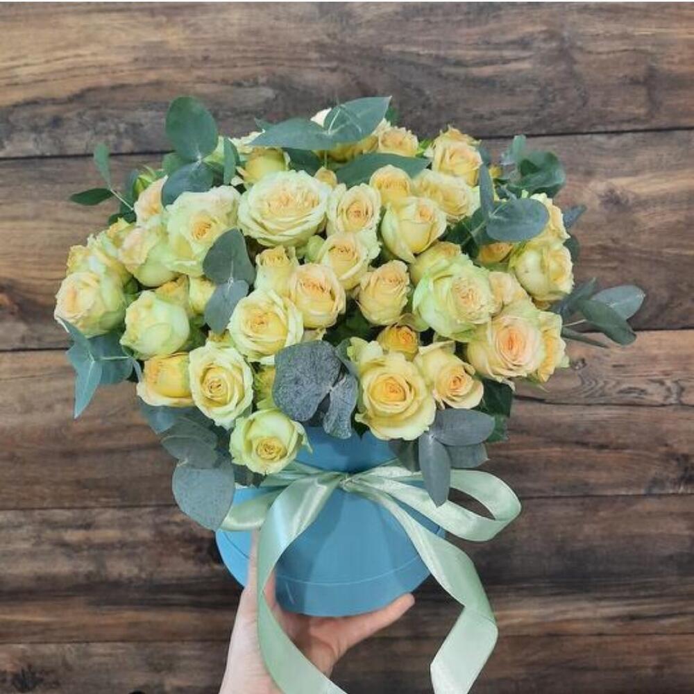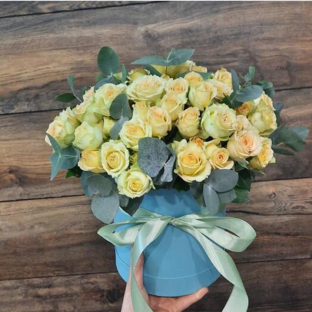 Эвкалипт - 1 шт. Кустовая роза - 9 шт. коробочка шляпная - 1 шт.