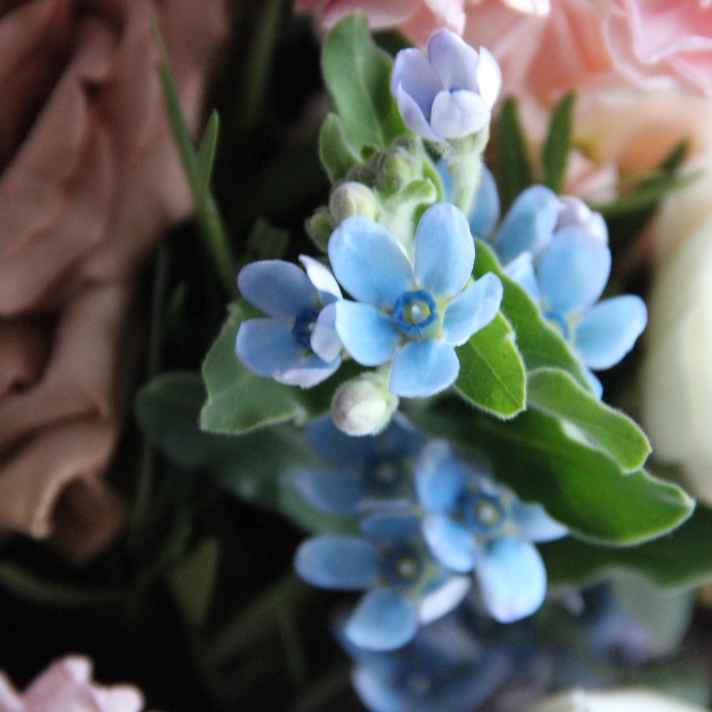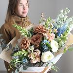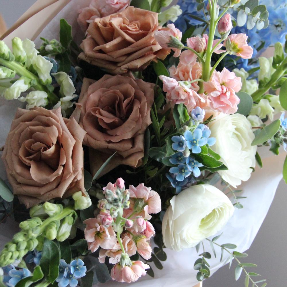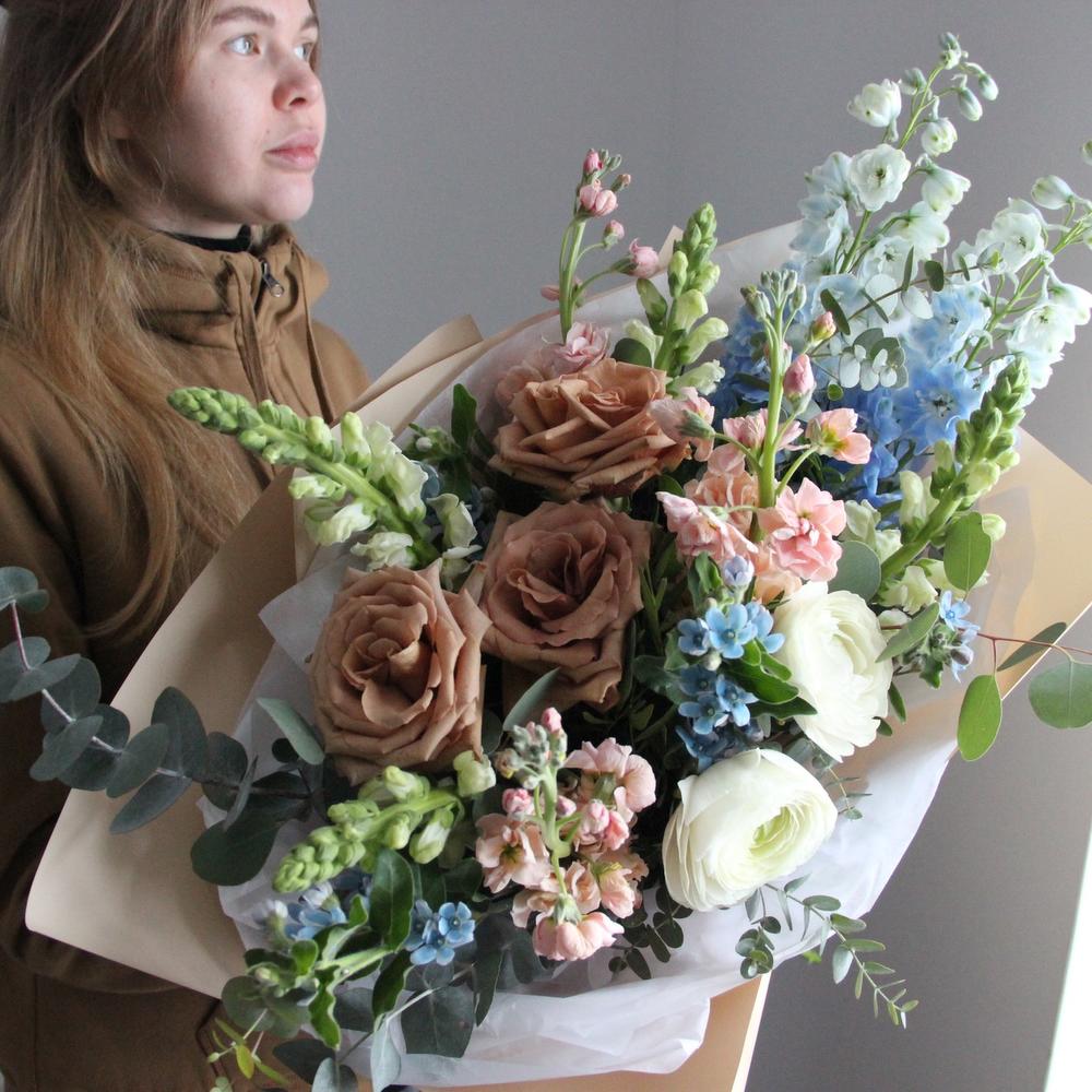 Букет с карамельными розами, голубым дельфиниумом и твидией, маттиолой, львиным зевом и эвкалиптом. Букет приедет к получателю на воде и в подарочной коробке!