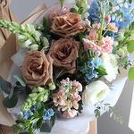 Дельфиниум - 2 шт. Маттиола - 3 шт. Эвкалипт - 5 шт. Лента атласная - 2 шт. Тишью - 2 шт. Бумага - 2 шт. Львиный зев - 3 шт. Твидия - 3 шт. роза toffee - 3 шт.