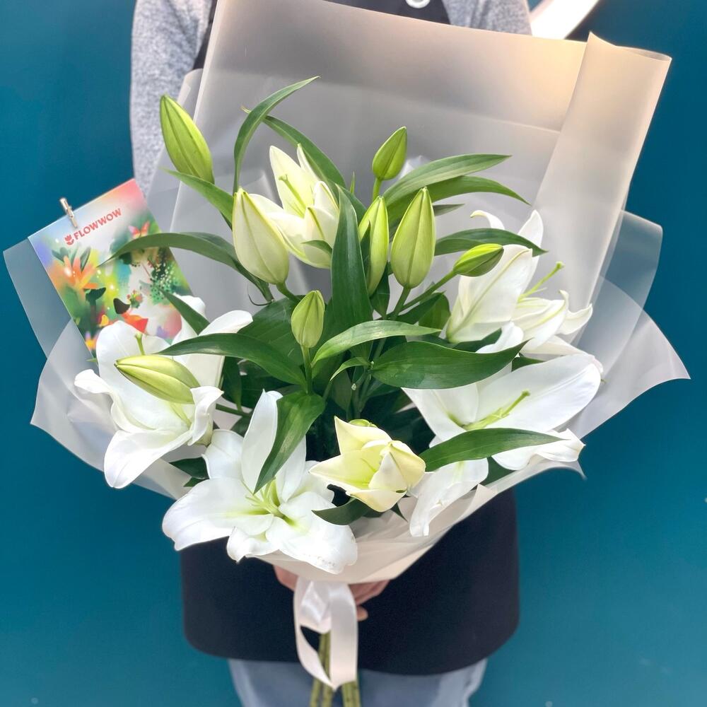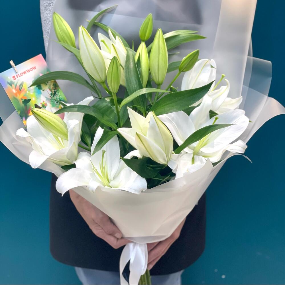 Представляем вашему вниманию великолепный букет из белоснежных цветов, созданный профессиональными флористами. Это идеальный подарок для любого торжества: дня рождения, годовщины, свадьбы или просто как знак внимания близкому человеку. Состав композиции🌿 Наши флористы создают каждый букет индивидуально, учитывая сезонность, доступность цветов и ваши пожелания. Мы можем дополнить композицию приятными сюрпризами: • Конфетами Rafaello • Мягкими игрушками • Открытками • Воздушными шарами Важная информация 🪷 Поскольку цветы — это живой материал, возможны незначительные изменения в сортах или оттенках при сохранении общей концепции и настроения композиции.