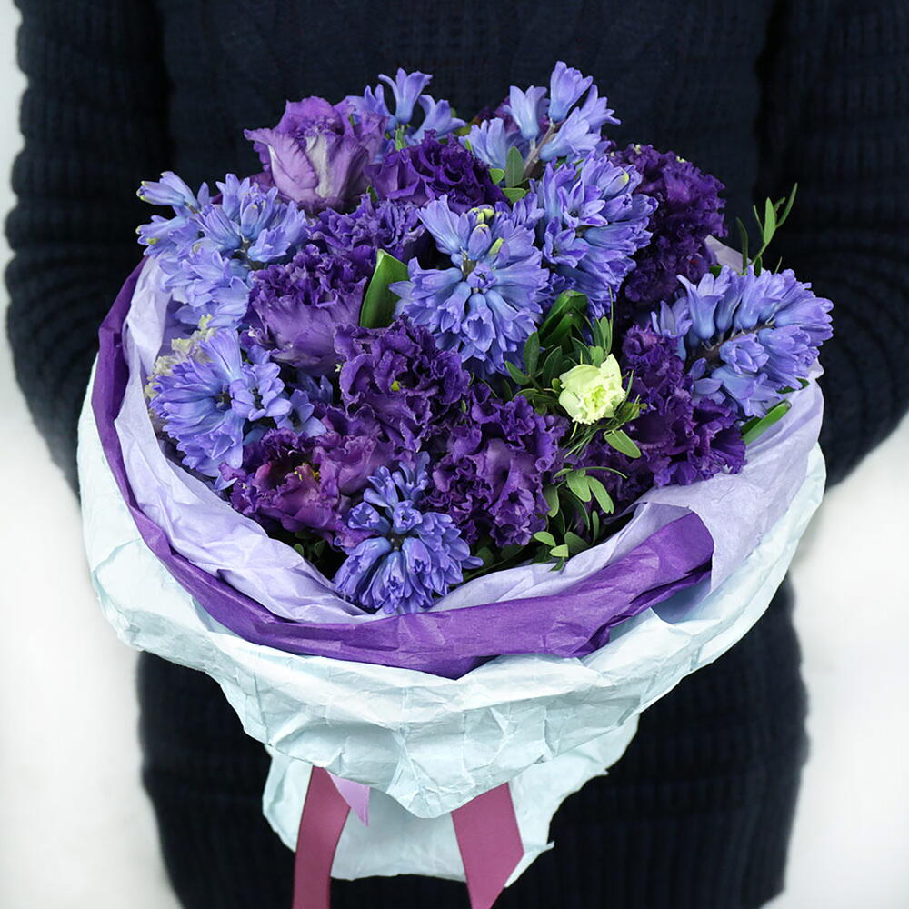 Лизиантус синий - 9 шт. листья фисташки - 1 шт. лента (за1м) - 1 шт. пленка прозрачная (за1м) - 1 шт. упаковка в ассортименте (за1м) - 1 шт. бумага тишью (за1шт) - 2 шт. гиацинт синий* - 9 шт.