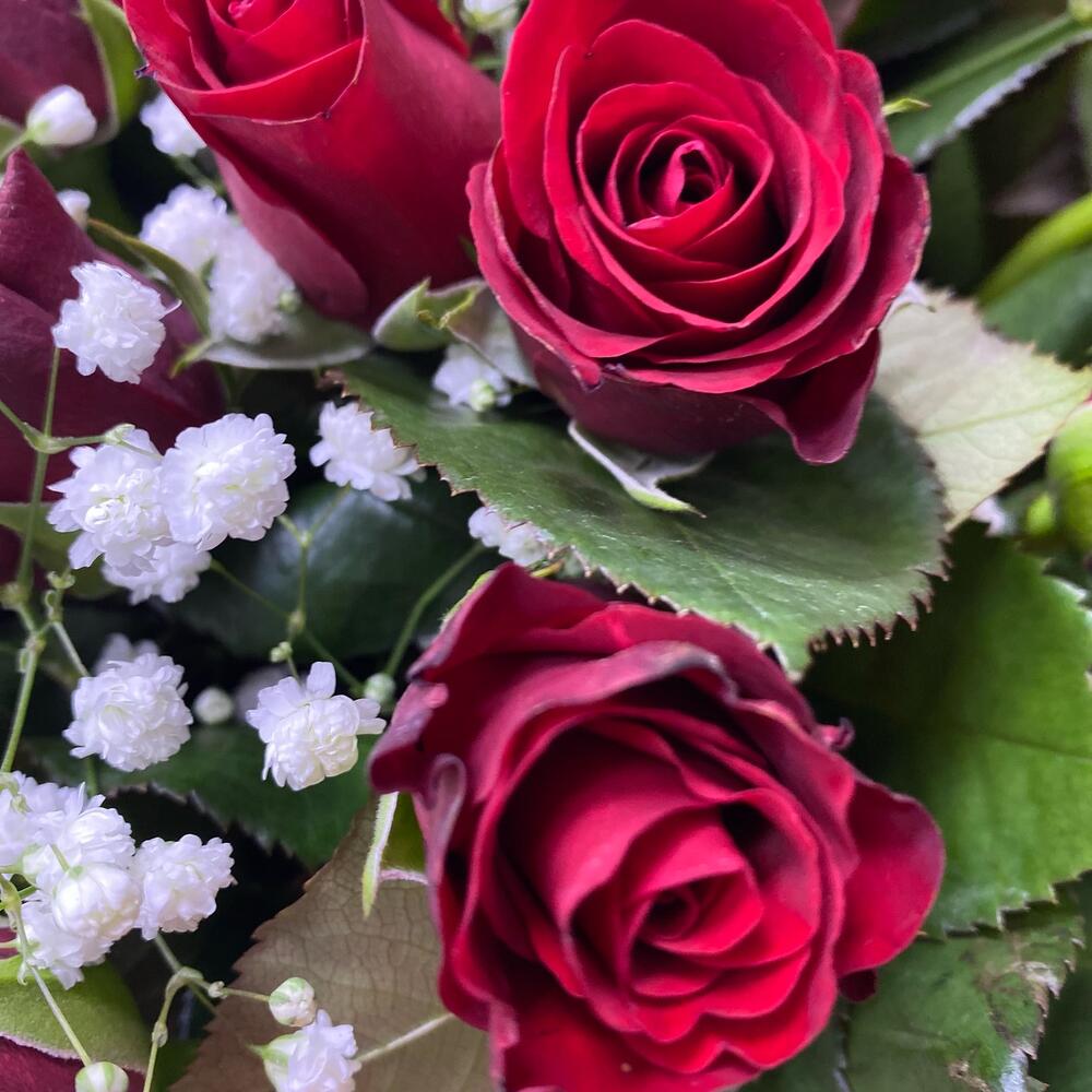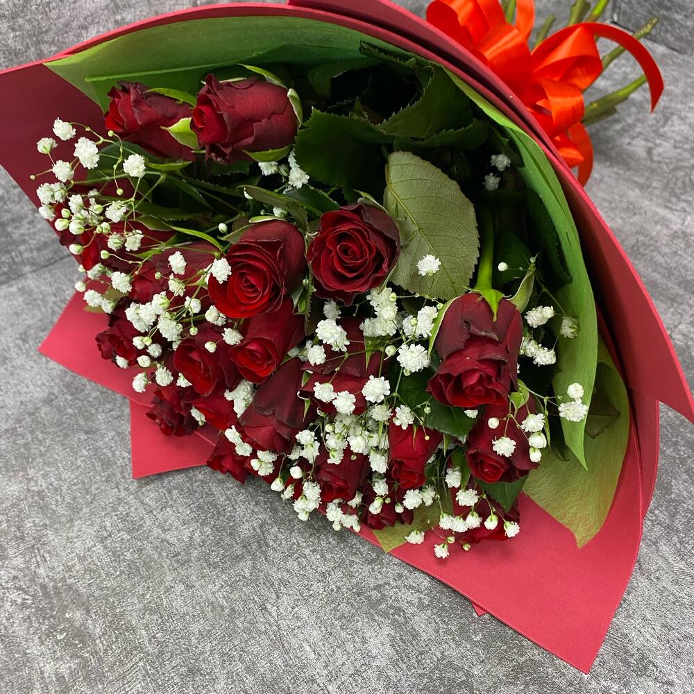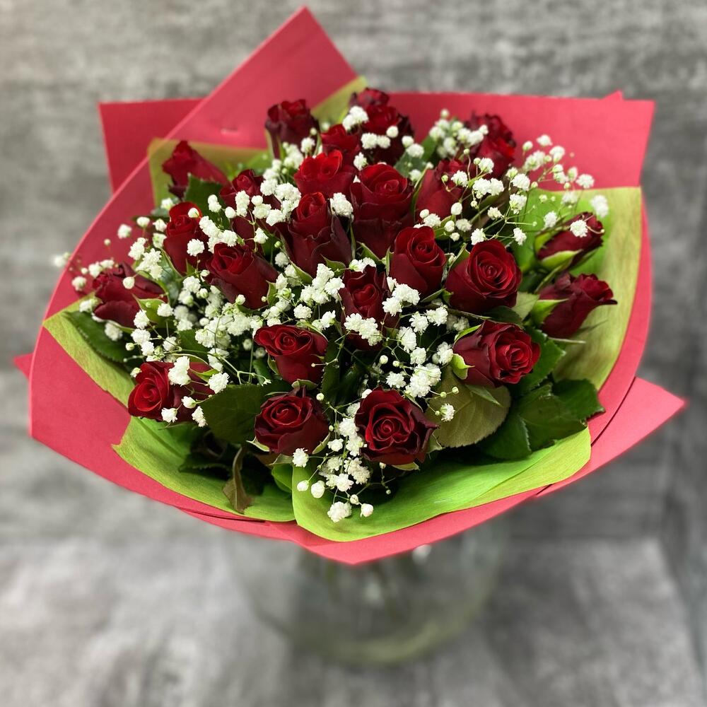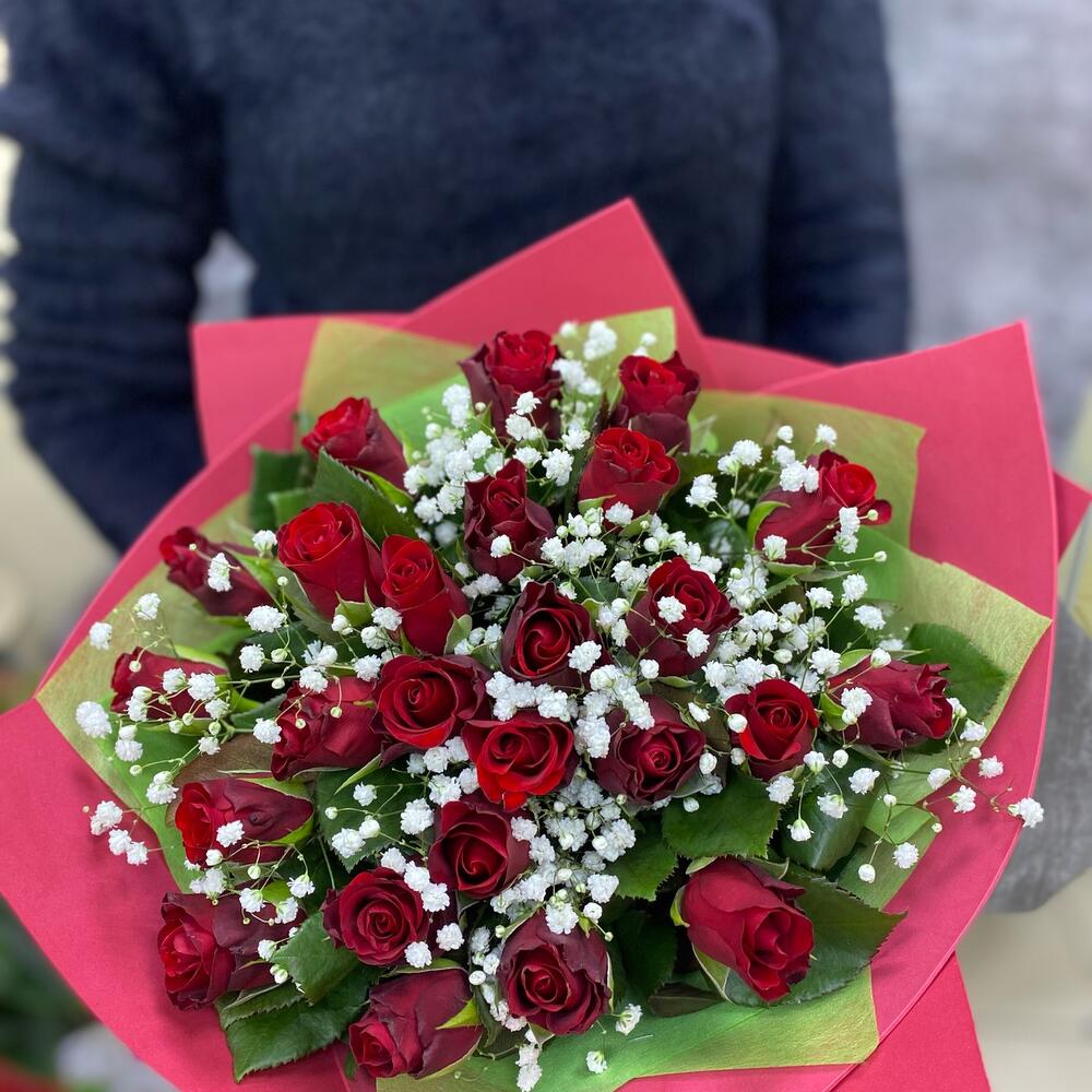 Гипсофила - 2 шт. Лента атласная - 1 шт. Фетр - 1 шт. Роза Кенийская 40 см - 25 шт. Фоамиран (упаковка) - 1 шт.