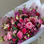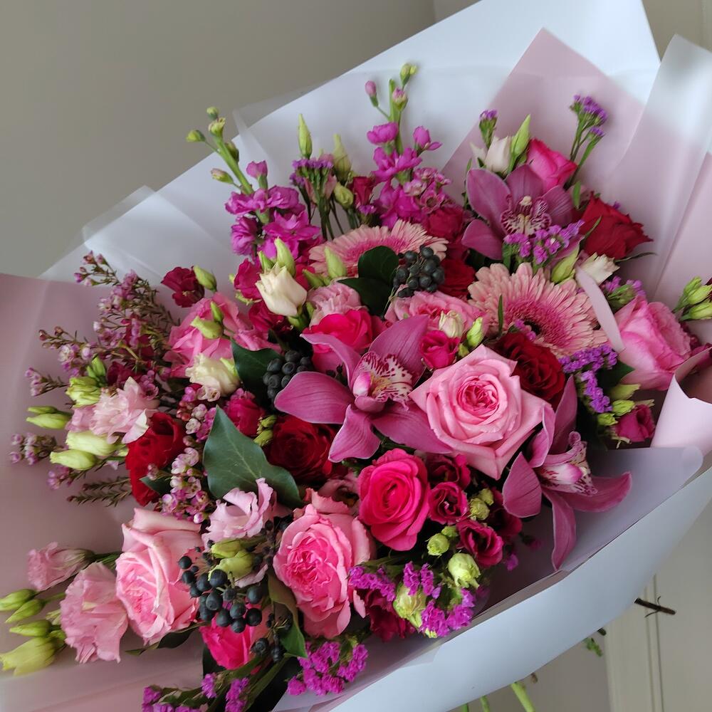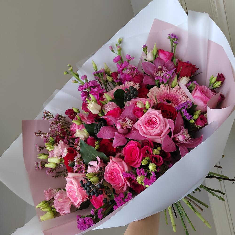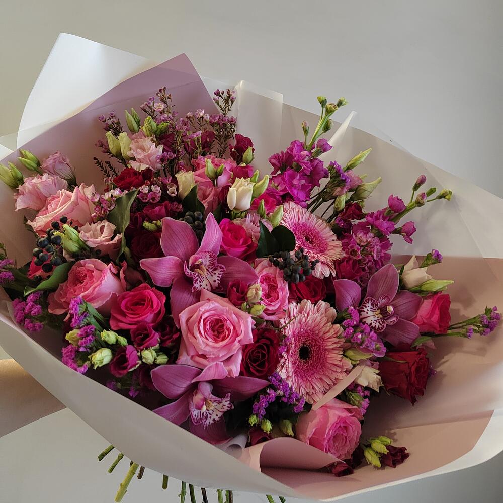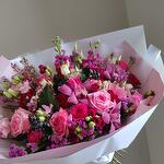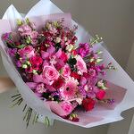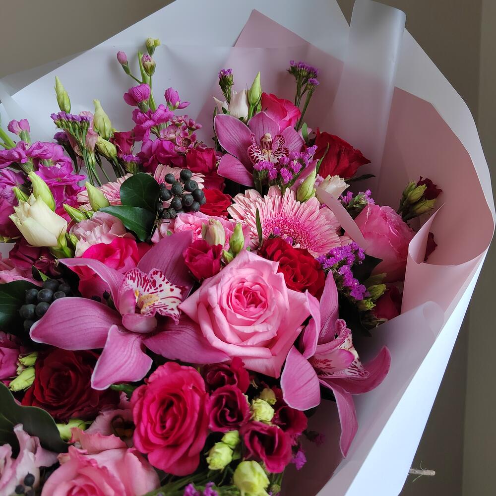 Маттиола - 2 шт. Статица - 5 шт. Эустома - 7 шт. Гербера - 2 шт. Хамелациум - 3 шт. орхидея - 3 шт. декоративная зелень - 5 шт. розы - 11 шт.