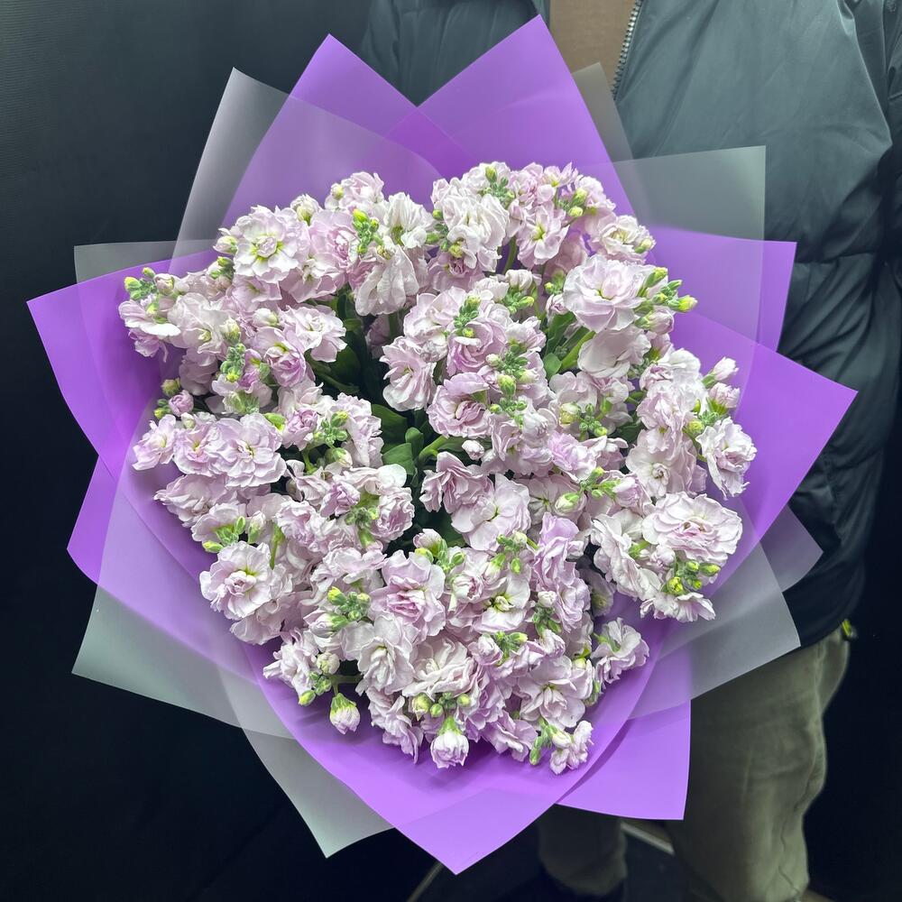 Стильный модный букет из матиоллы в фиолетовый упаковке