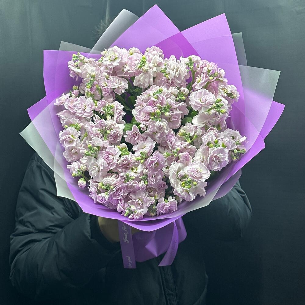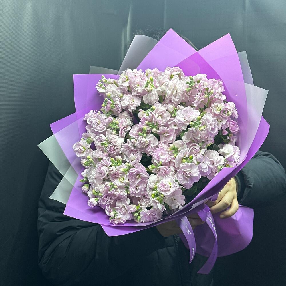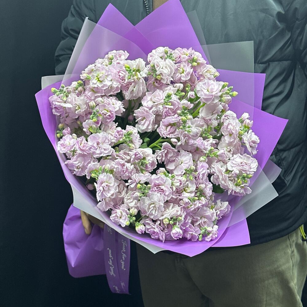 Маттиола - 15 шт. Лента атласная - 1 шт. Открытка - 1 шт. Упаковка дизайнерская - 4 шт.