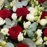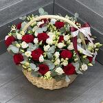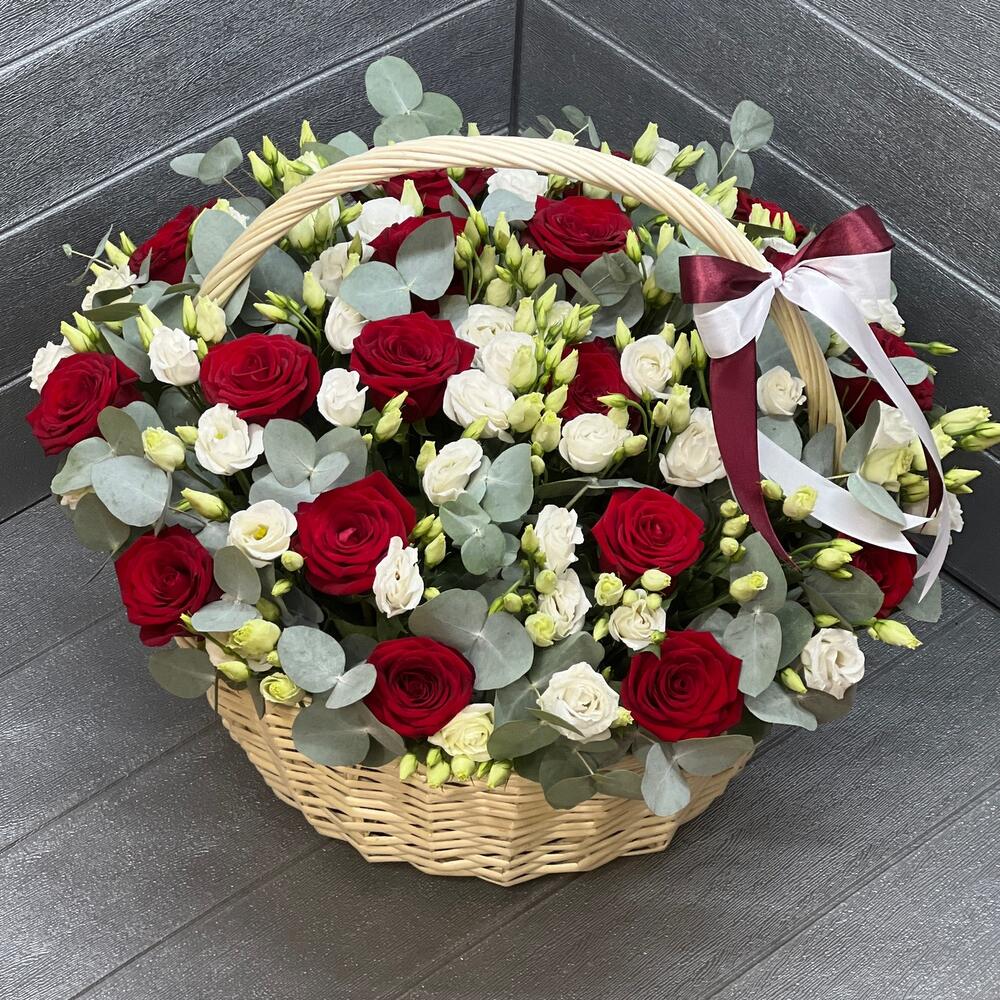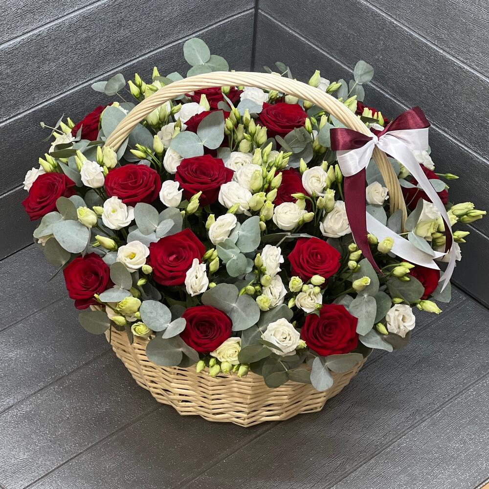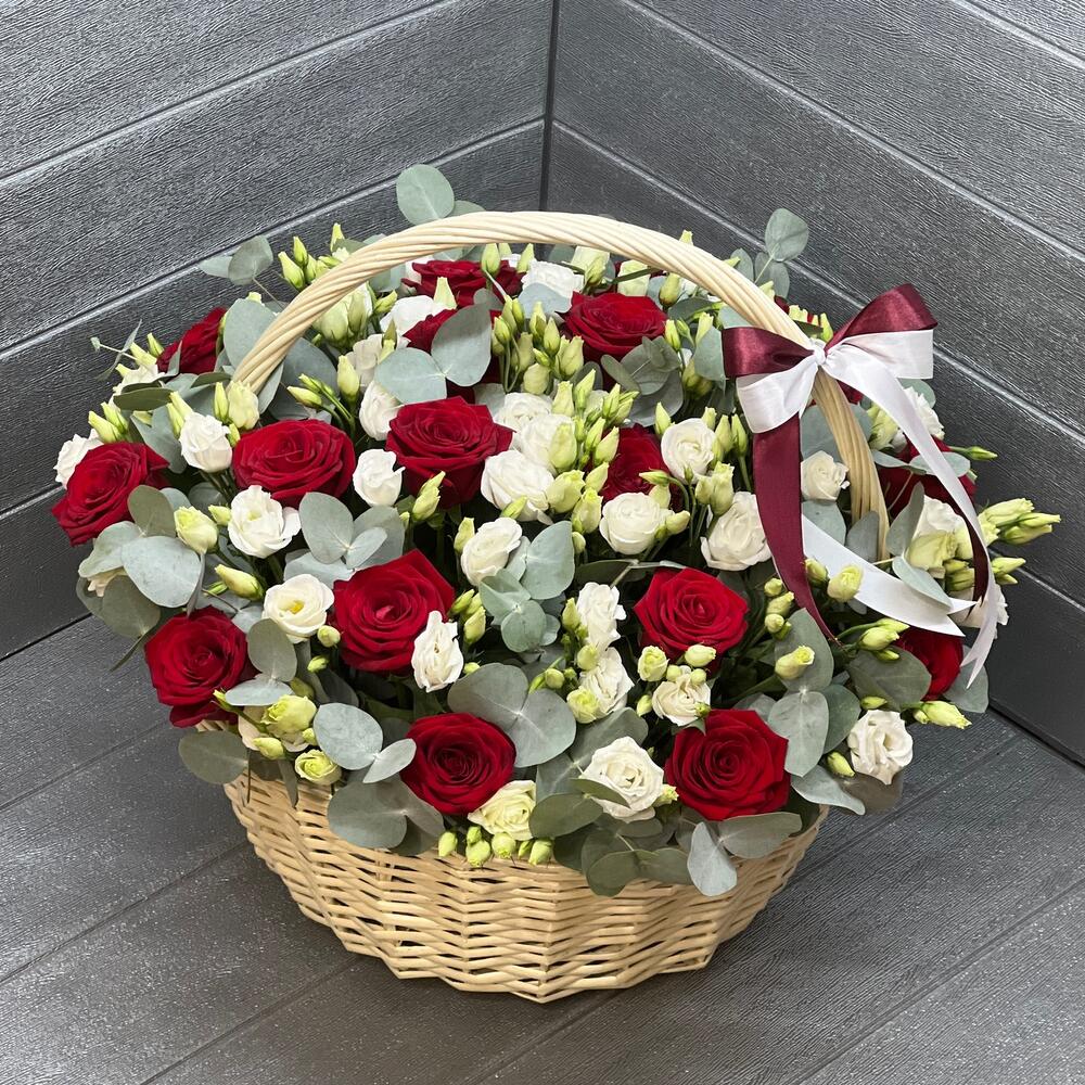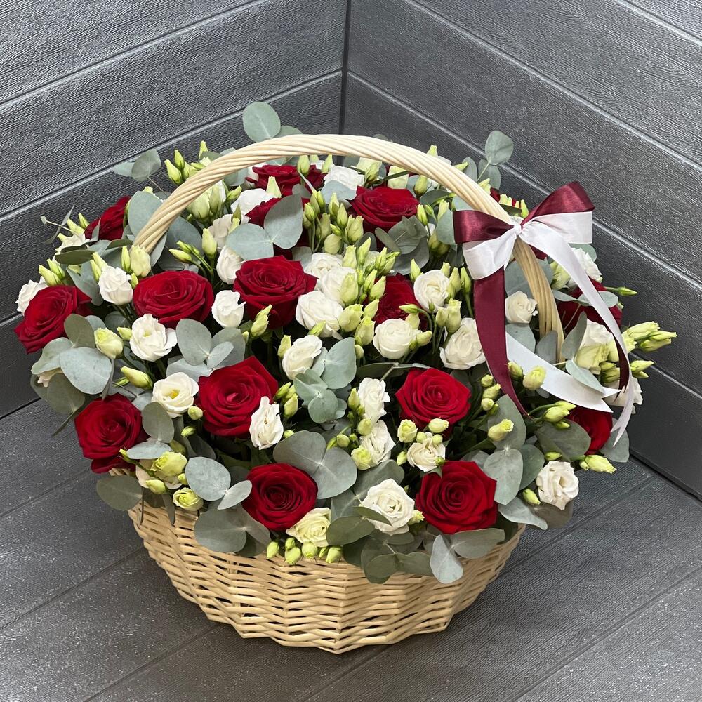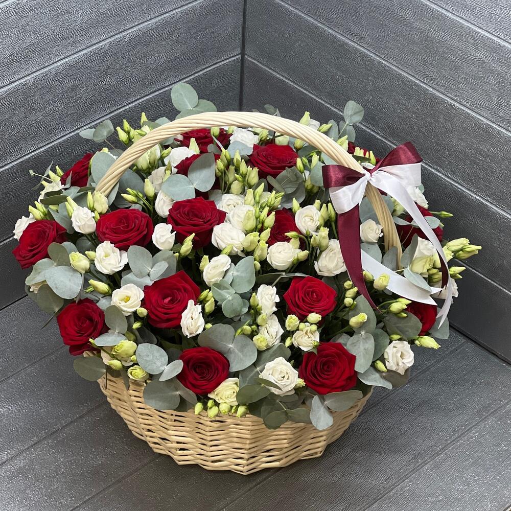 Корзина - 1 шт. Роза красная - 20 шт. Эвкалипт - 35 шт. Атласная лента - 2 шт. Оазис флористический - 4 шт. эустома белая - 25 шт.