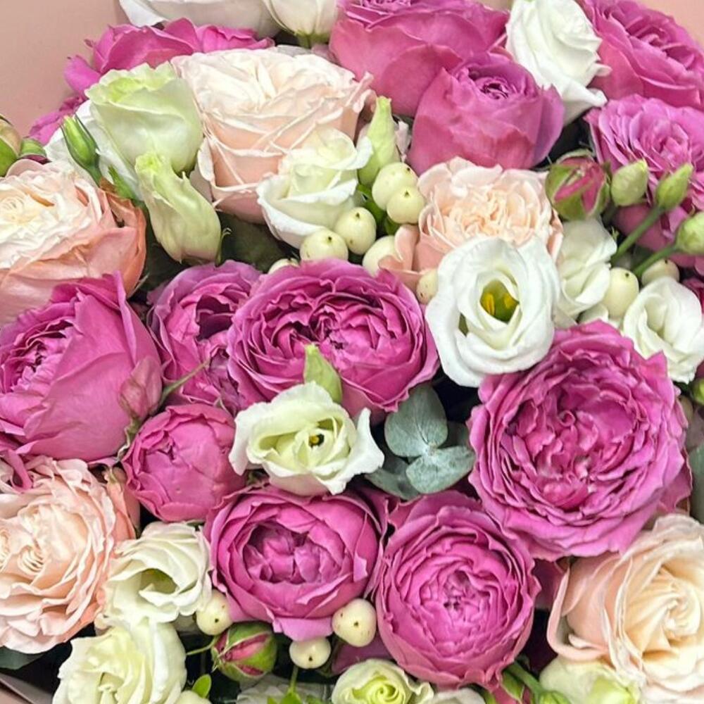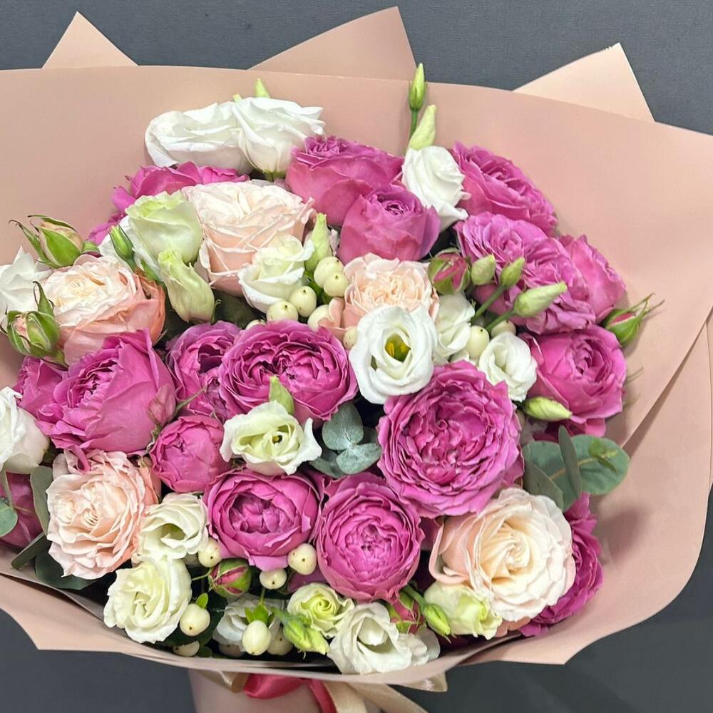 В букете роскошная пионовидная кустовая роза сорта Мисти Баблз и Бомбастик, эустома белого цвета с добавлением эвкалипта. Упаковка из матовой пленки отлично подчеркивает цветы в букете.