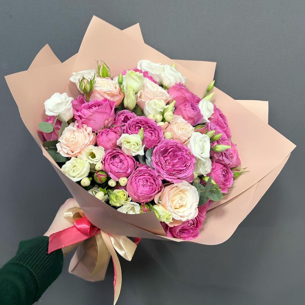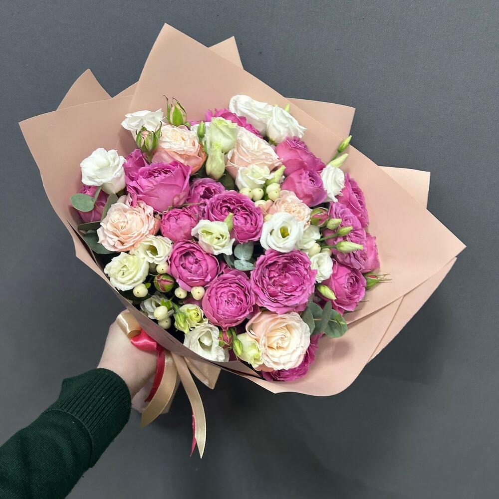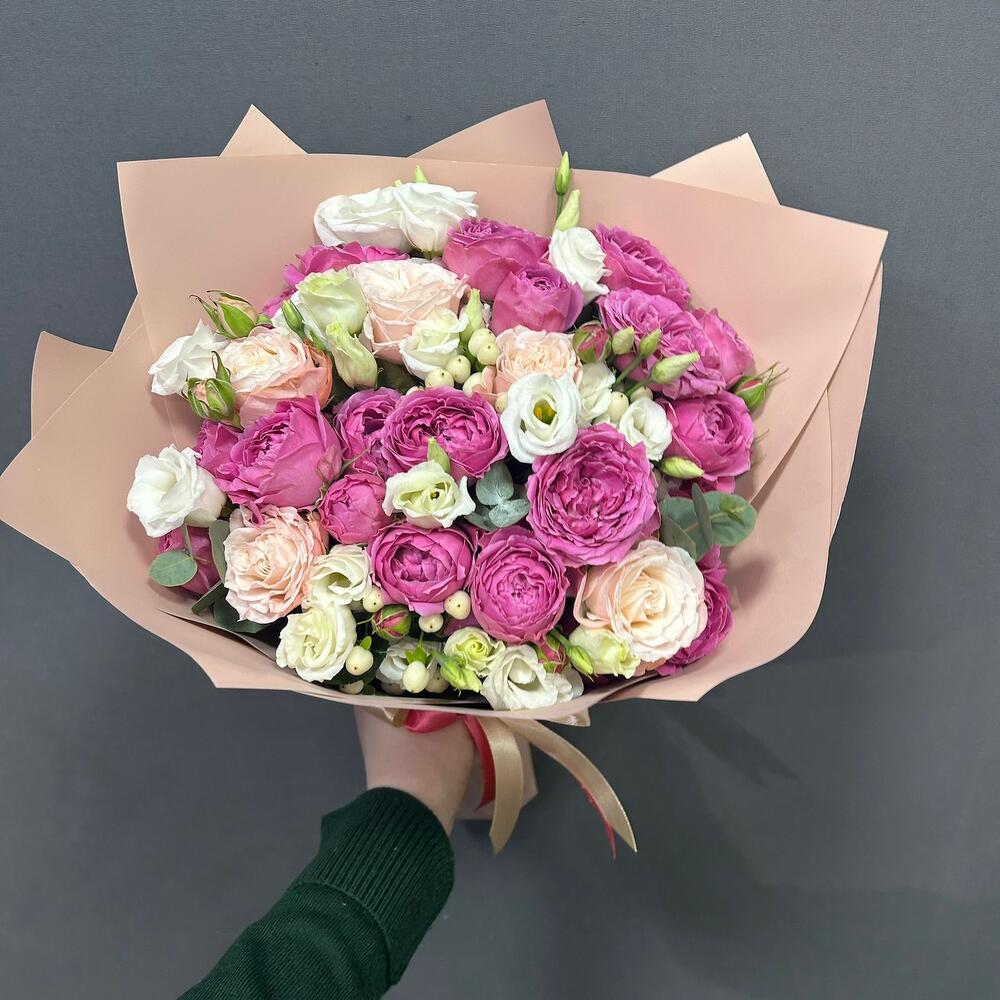 Микс из эустом, пионовидных роз Мисти Баблс и Бомбастик