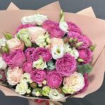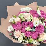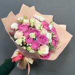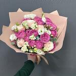 Роза кустовая Бомбастик - 3 шт. Эвкалипт - 1 шт. Эустома - 4 шт. Пленка - 1 шт. Роза кустовая misty bubbles - 4 шт.