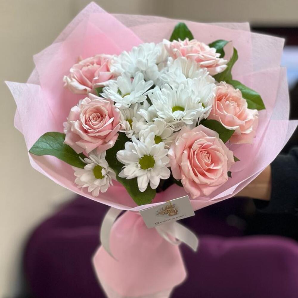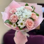 Хризантема кустовая - 2 шт. Роза - 5 шт. Зелень - 4 шт. Упаковка дизайнерская - 5 шт.