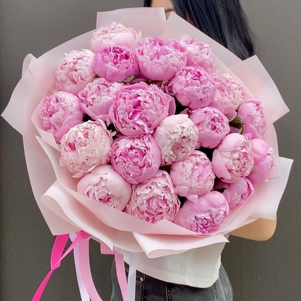 Лента атласная - 3 шт. Упаковка дизайнерская - 1 шт. Открыточка с вашими пожеланиями - 1 шт. пионы розовые - 23 шт. отличное настроение от флориста - 100 шт.