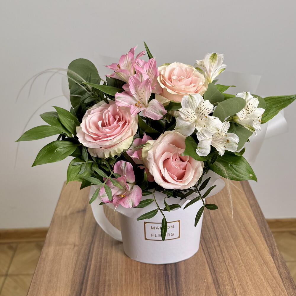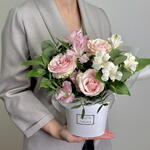 Рускус - 4 шт. Роза Эквадор - 3 шт. Коробка - 1 шт. Флористическая губка - 1 шт. Стифа - 1 шт. альстромерия микс - 3 шт.