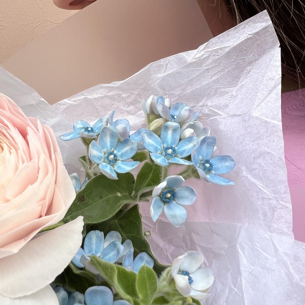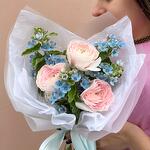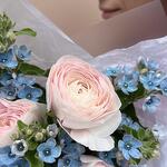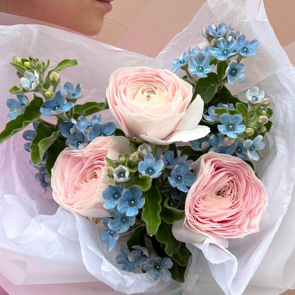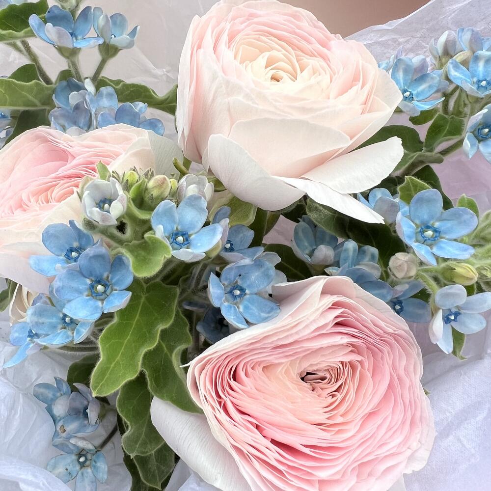 Милый кулек «Нежность небес»: нежно-розовые ранункулюсы и оксипеталум небесного цвета в крафтовом пакете