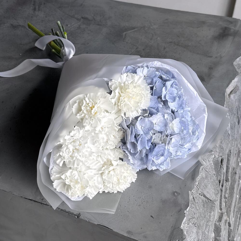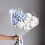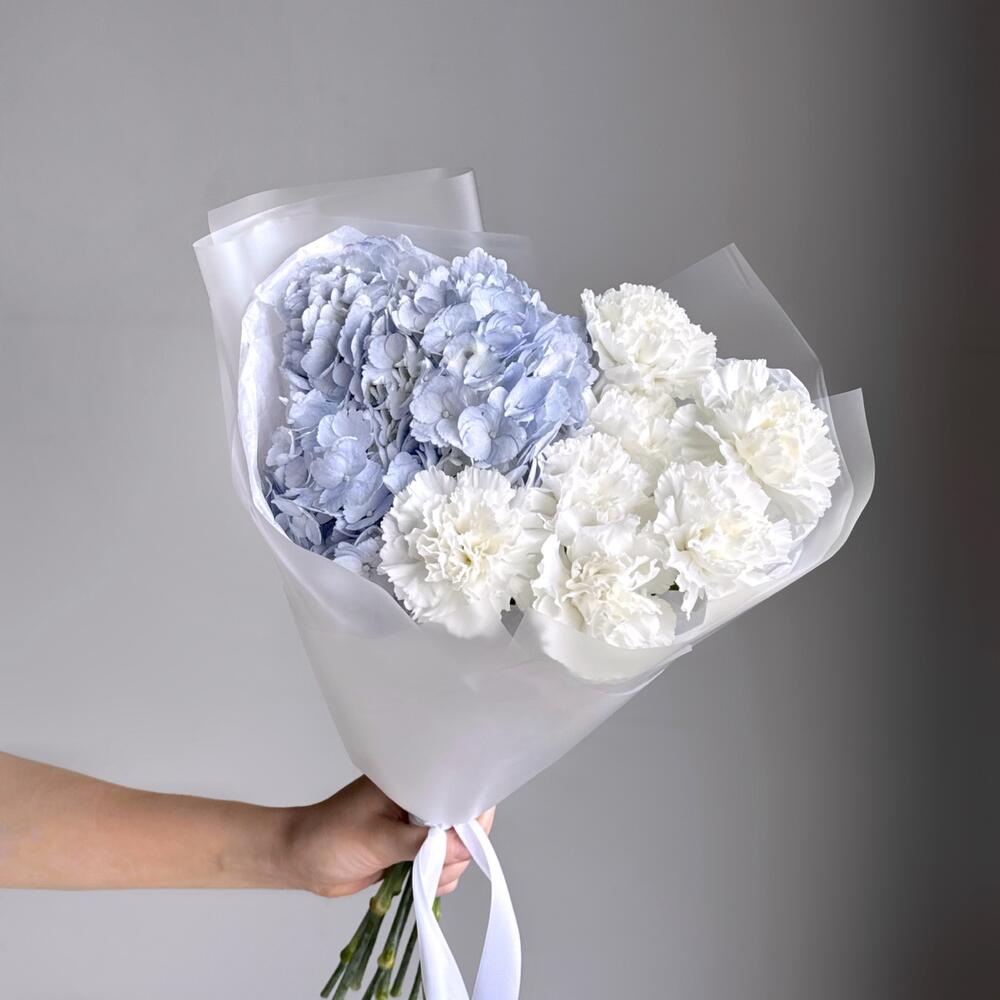 Упаковка дизайнерская - 1 шт. Гортензия голубая - 1 шт. Диантус белый - 7 шт.