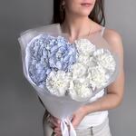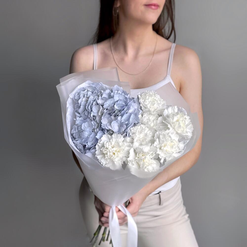 Милый нежный букет голубая гортензия и белый диантус
