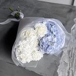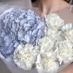 Нежный букет в пастельных тонах из голубой гортензии и белых диантусов :) Не забудьте подрезать цветы перед тем как ставить в вазу. Не храните букет на прямых солнечных лучах и возле отопительных приборов, чтобы сохранить цветы свежими как можно дольше.