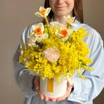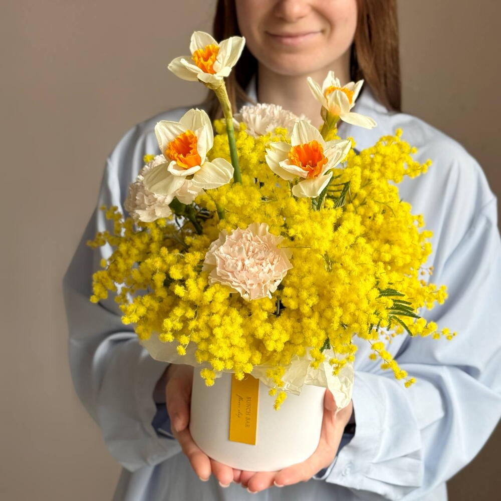 Мимоза - 5 шт. Нарцисс - 4 шт. Гвоздика - 3 шт. Коробка и оазис - 1 шт. инструкция по уходу за цветами - 1 шт.