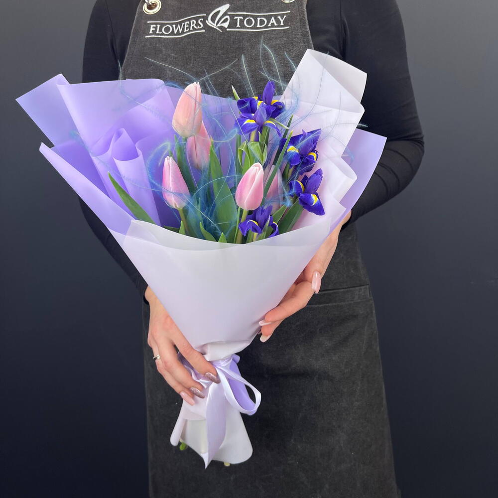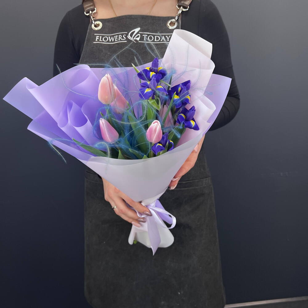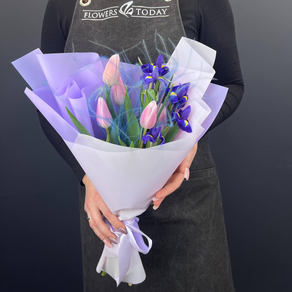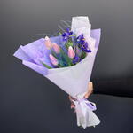 Этот великолепный букет включает в себя нежные тюльпаны, изящные ирисы и яркие лагурасы. Сочетание различных цветов и текстур делает этот букет стильным и утонченным. Красиво упакованный в дизайнерскую упаковку, он будет прекрасным подарком для любого случая.