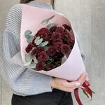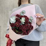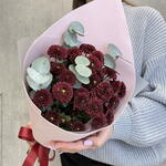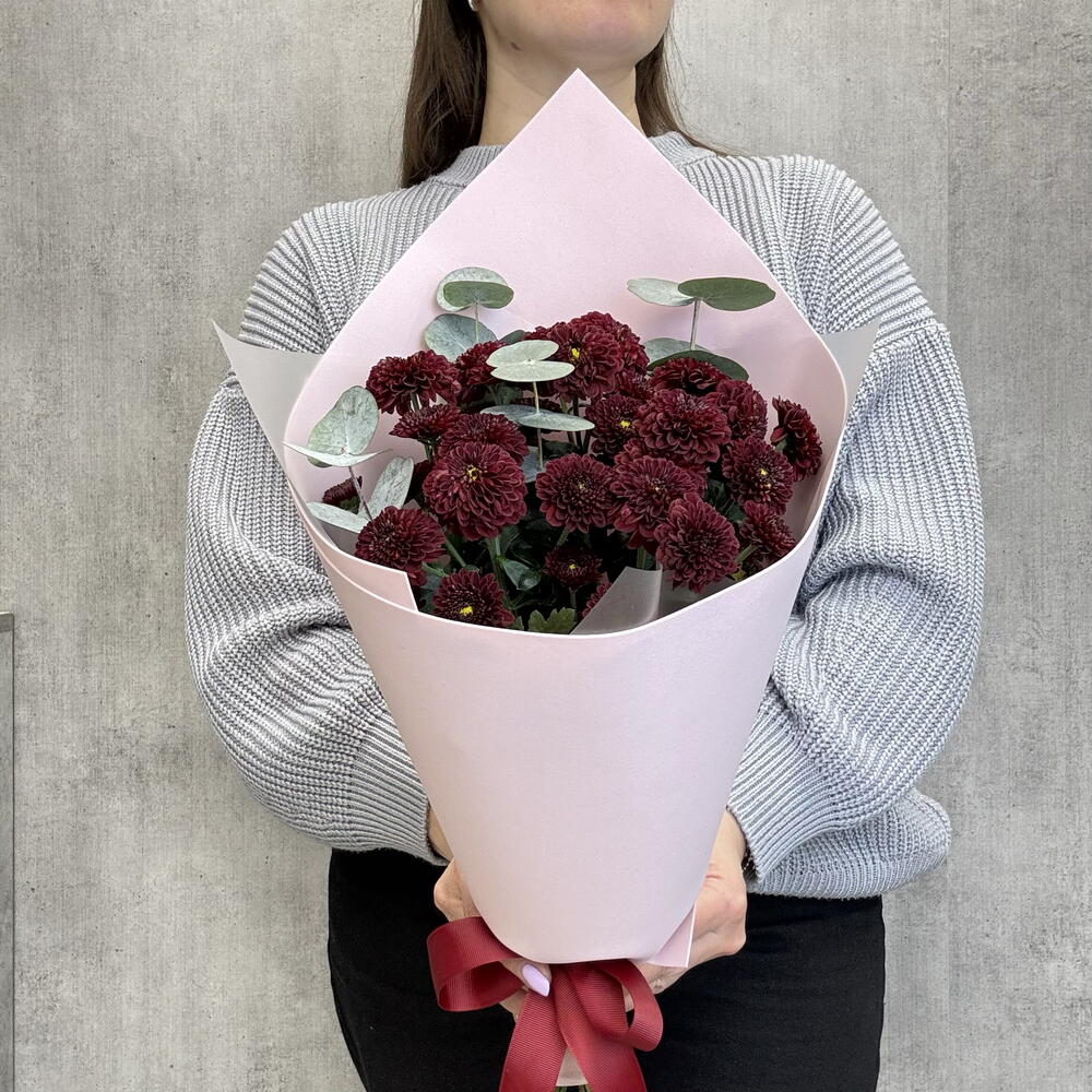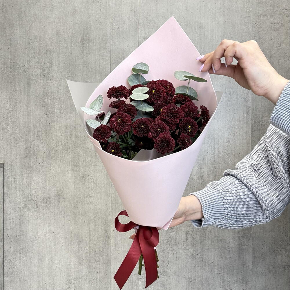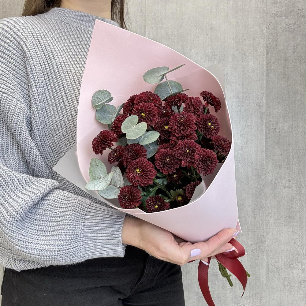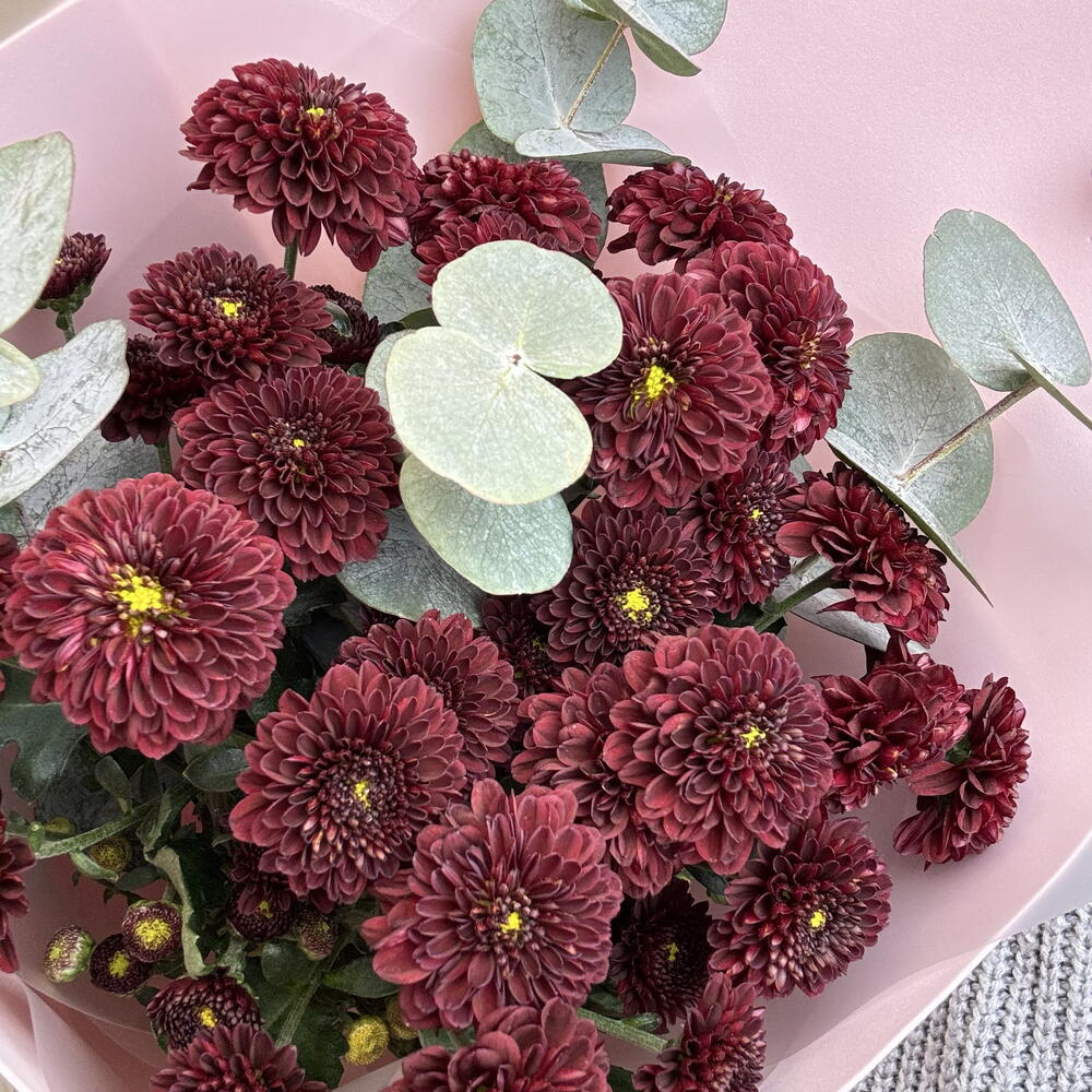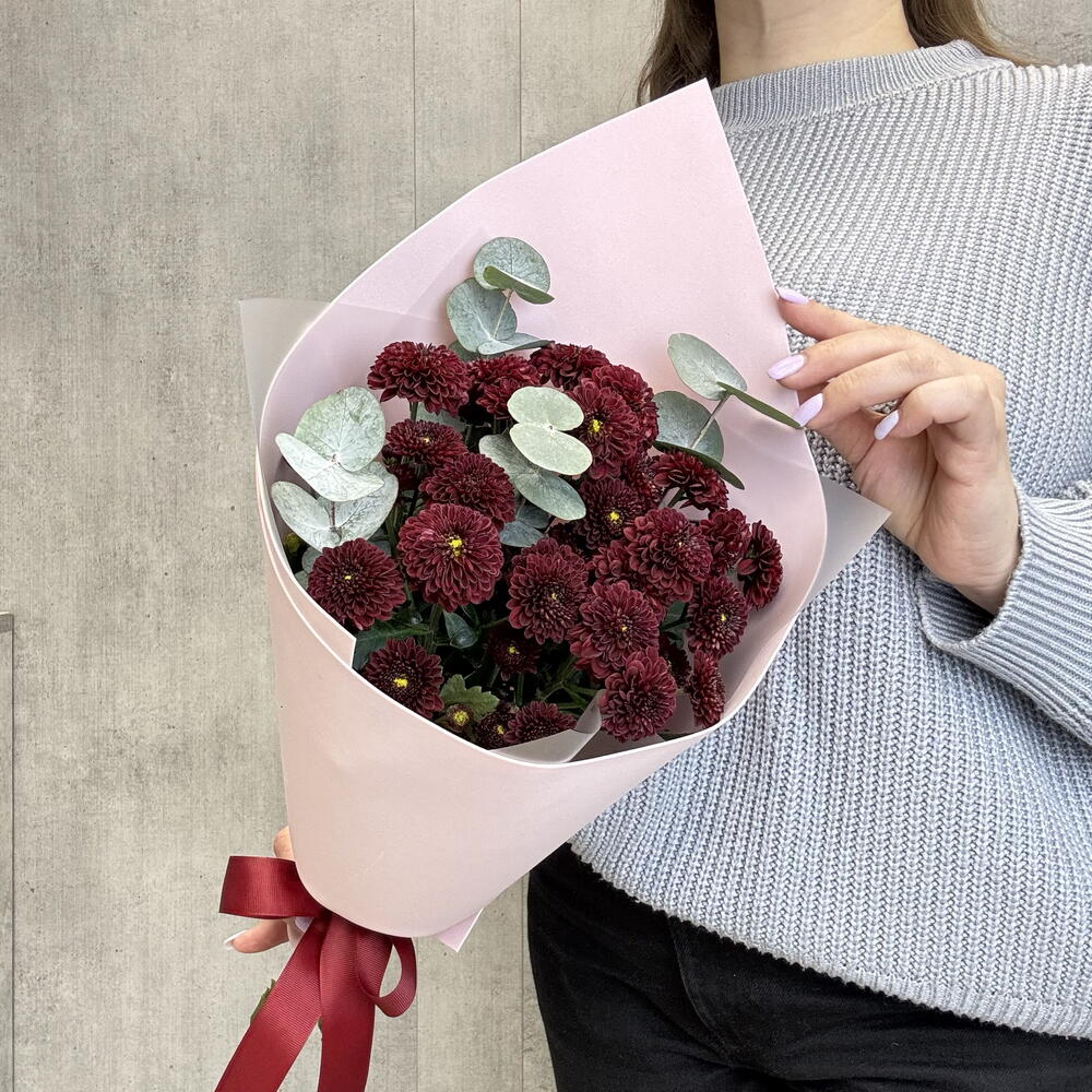 Минибукет комплимент их бордовых хризантем Сантини и эвкалипта