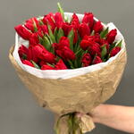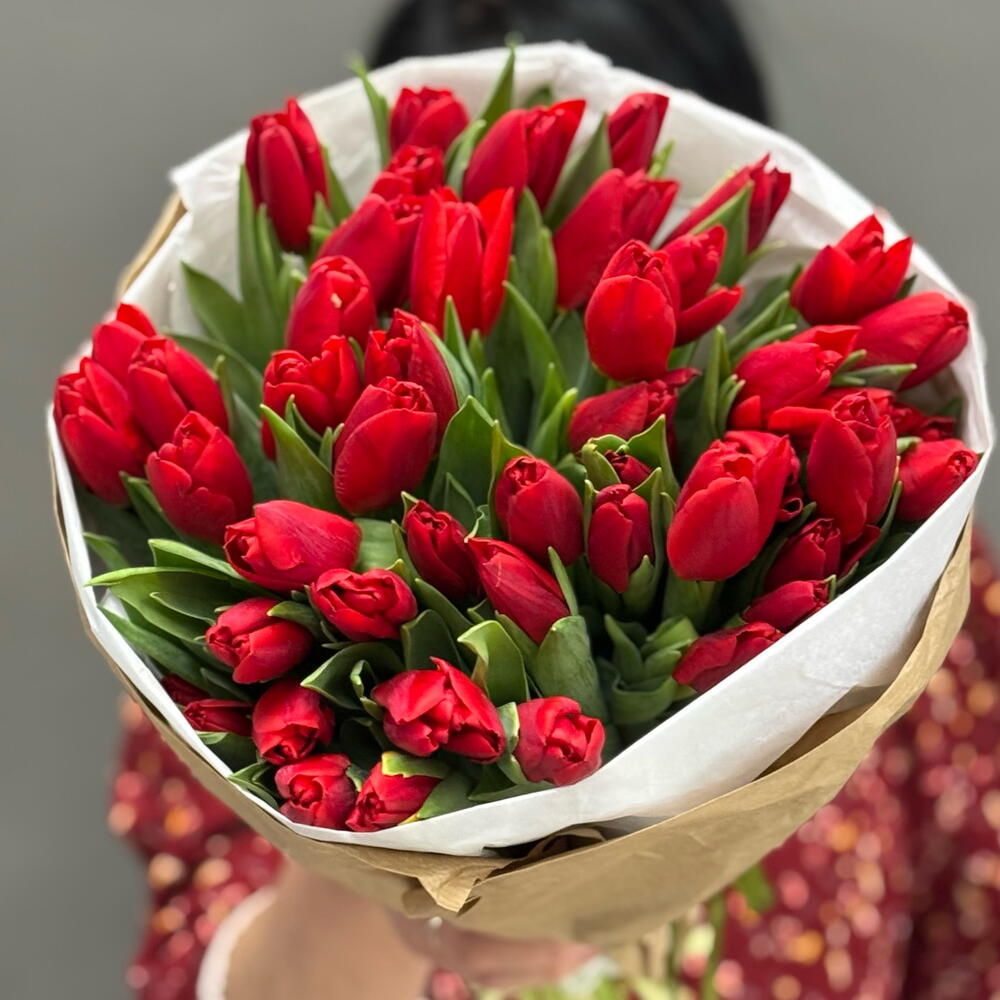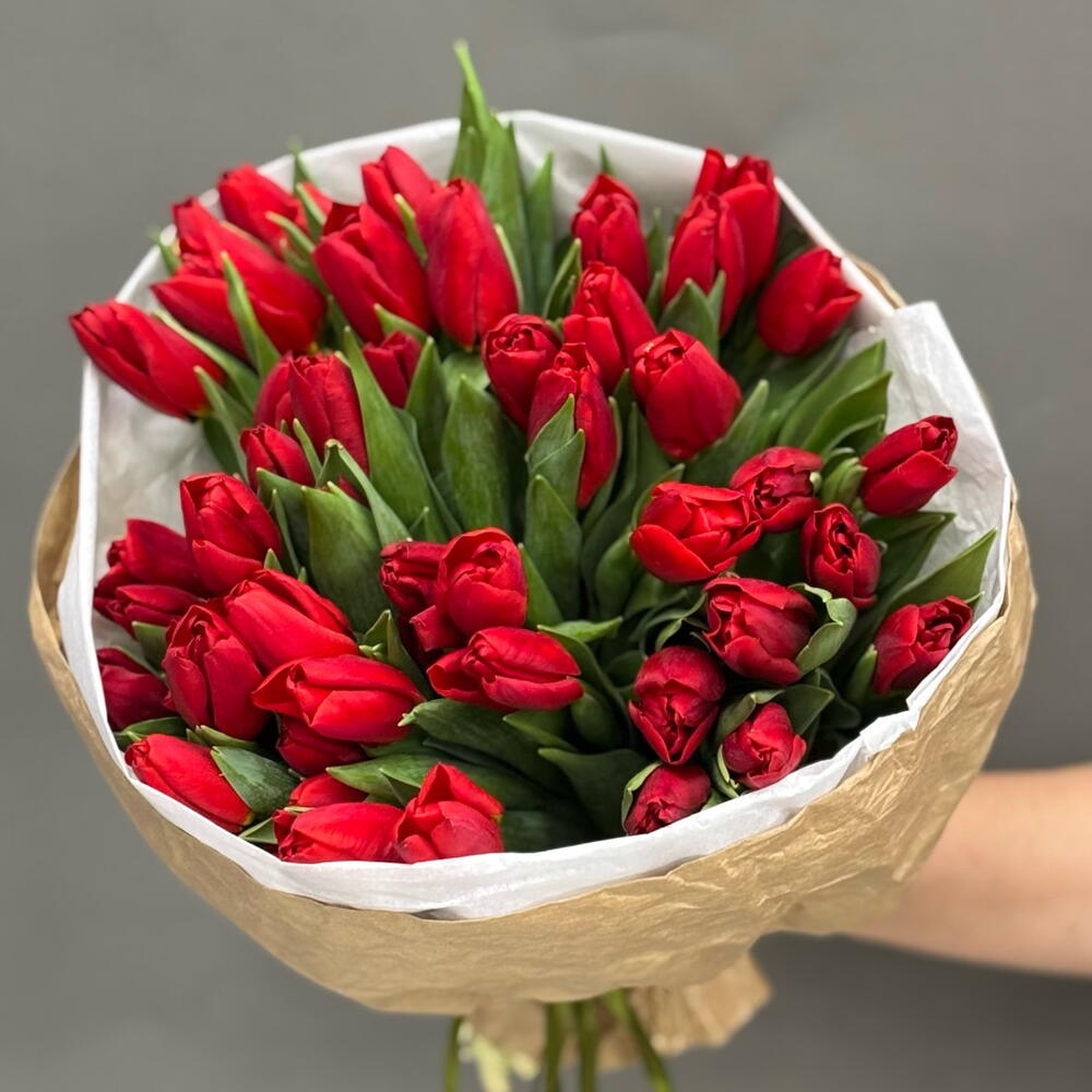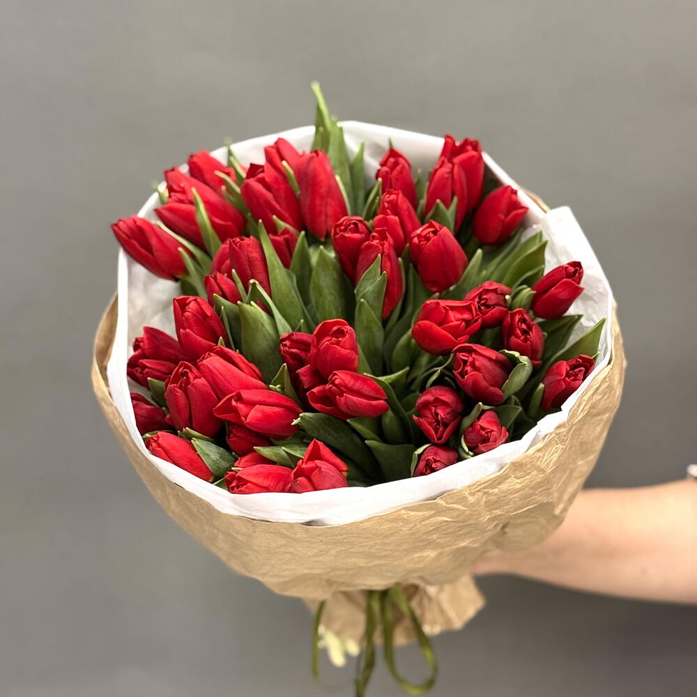 Тюльпан - 25 шт. Лента атласная - 1 шт. Крафт - 1 шт. Тишью белое - 2 шт.
