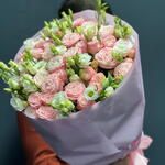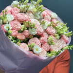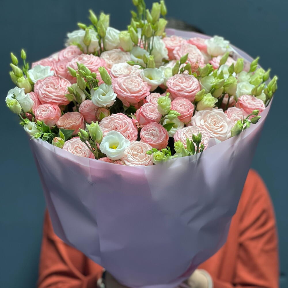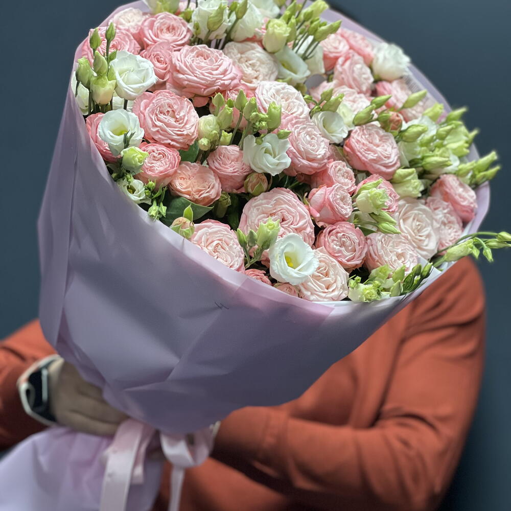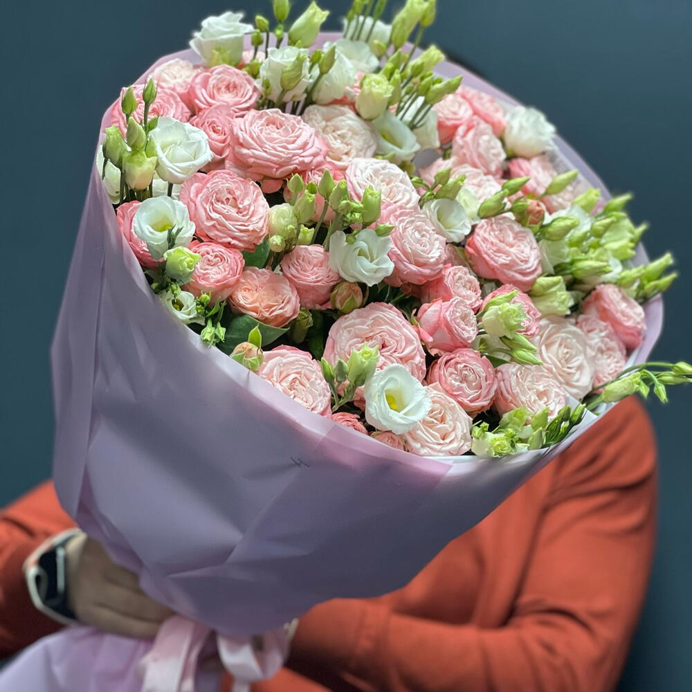 Романтичный букет из эустомы и кустовых роз. Идеально подойдёт для признания, поздравления или приятного сюрприза близкому человеку.