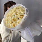 Лента атласная - 1 шт. Тишью - 3 шт. Роза белая - 15 шт. Пленка матовая - 3 шт.
