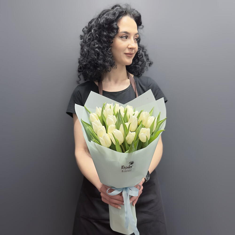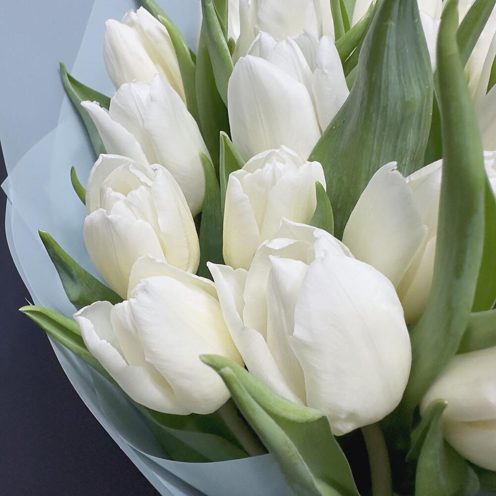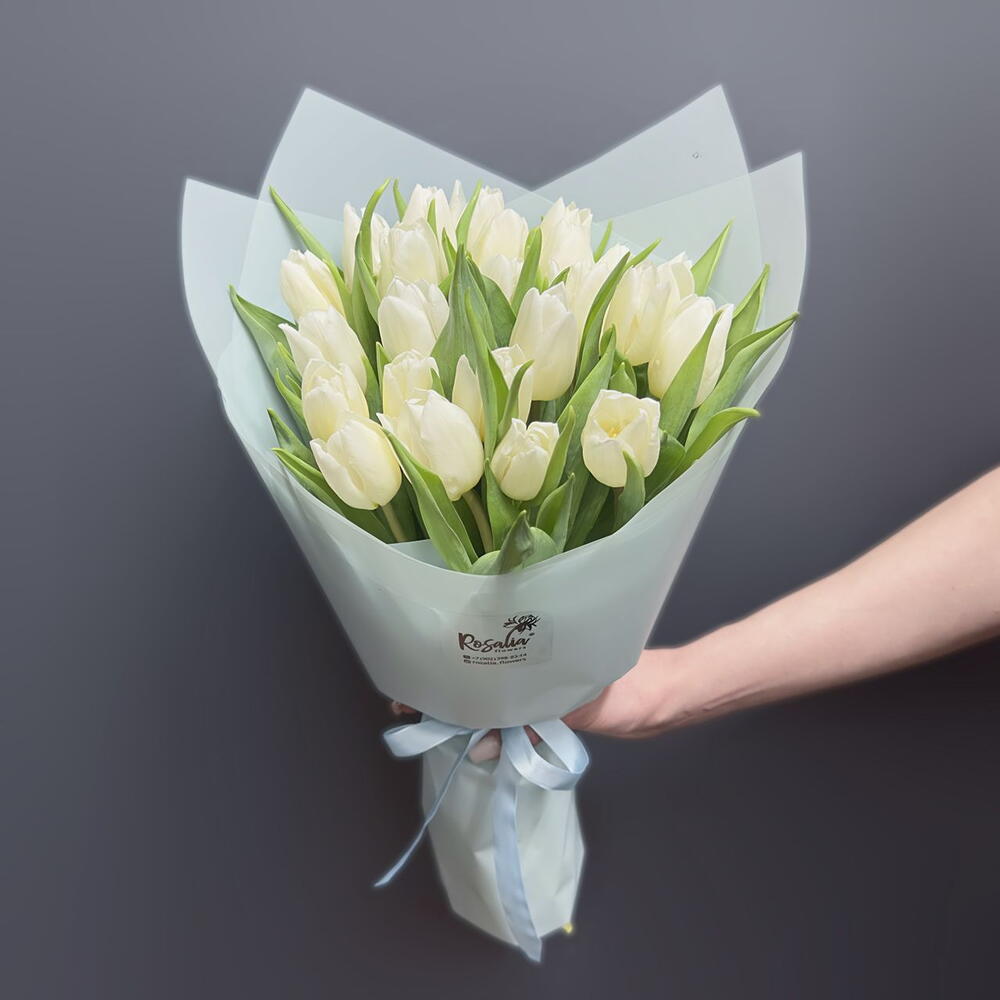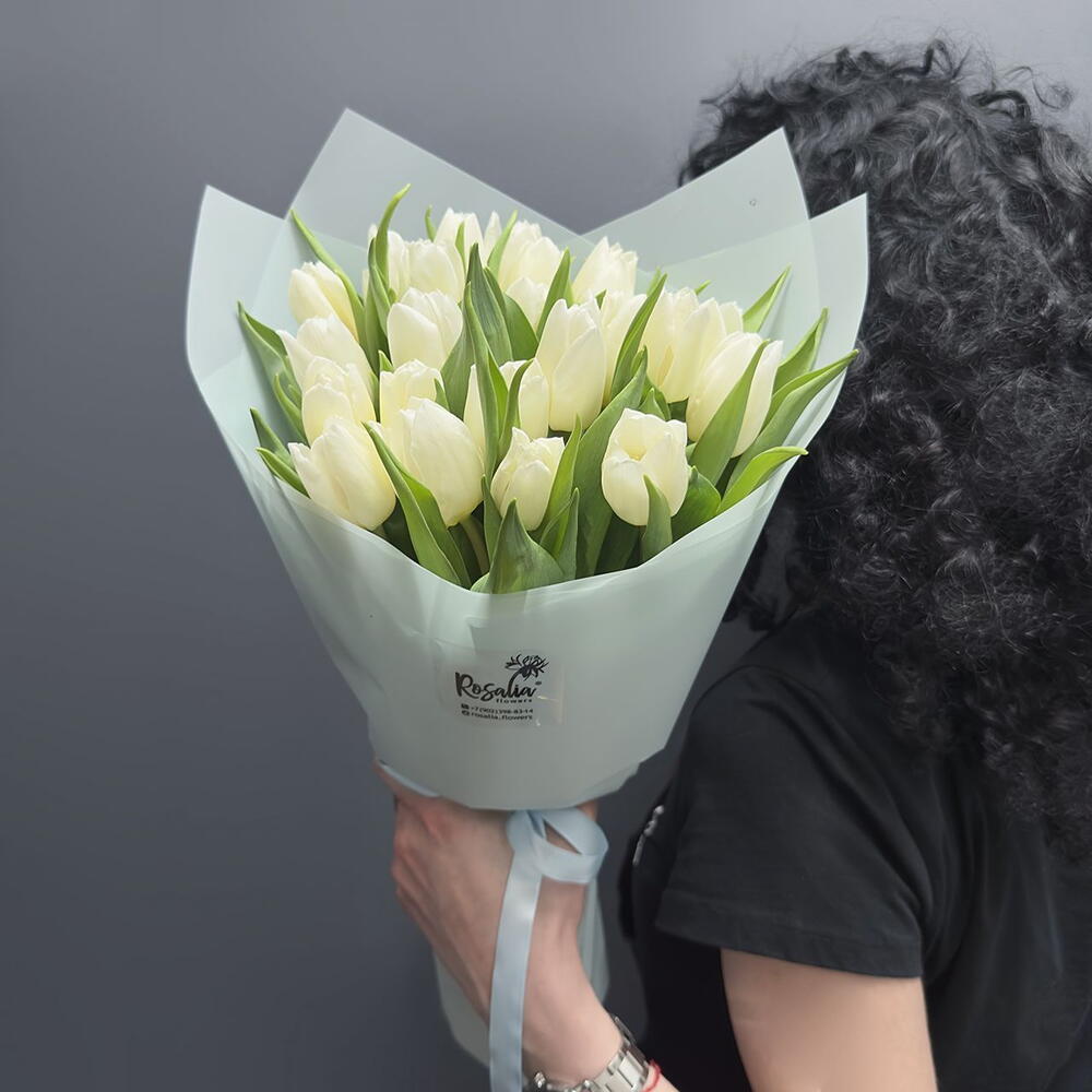 Монобукет из 25 белых пионовидных тюльпанов с оформлением Доставляется в транспортировочной коробке Состав: упаковка пленка матовая, тюльпаны Ширина, см: 25 Длина, см: 25 Высота, см: 35 Вес: 0.9 кг..