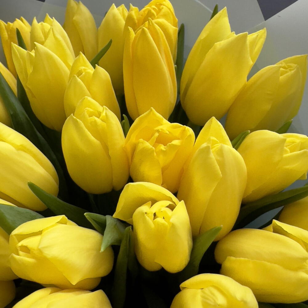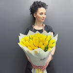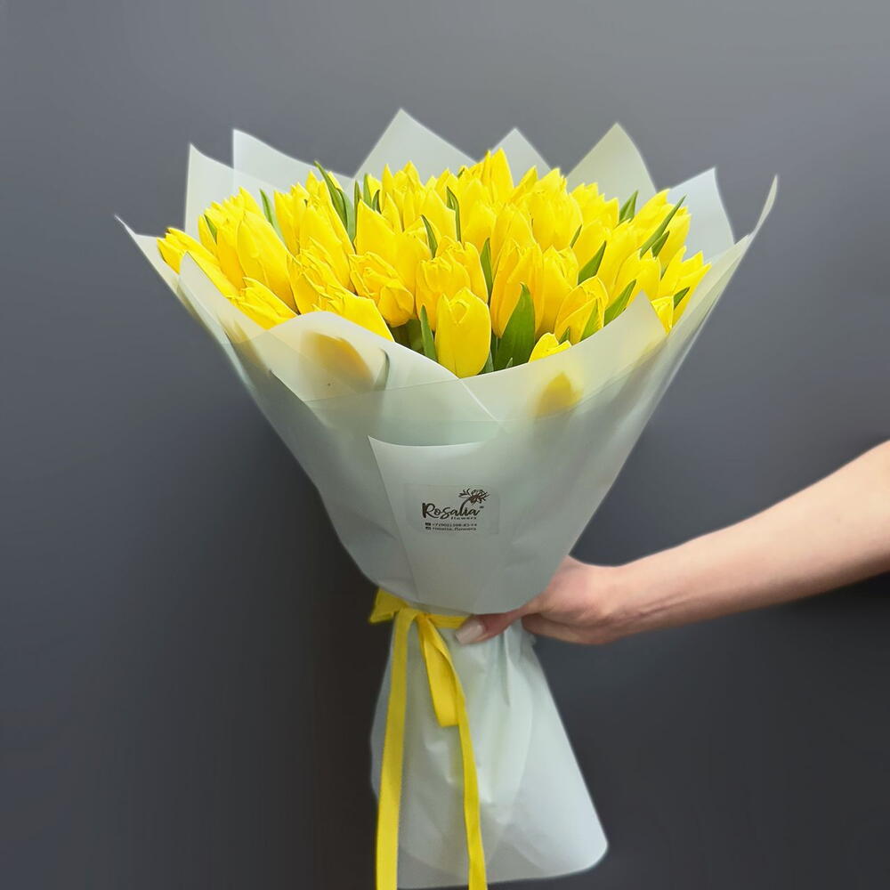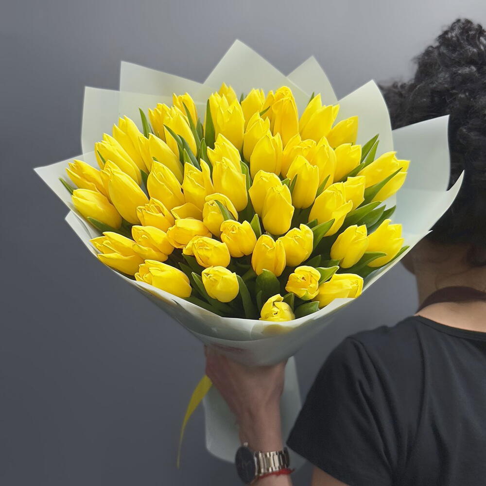 Монобукет из 51 желтого тюльпана с оформлением Доставляется в транспортировочной коробке Состав: упаковка пленка матовая, тюльпаны Ширина, см: 35 Длина, см: 35 Высота, см: 40 Вес: 0.9 кг..