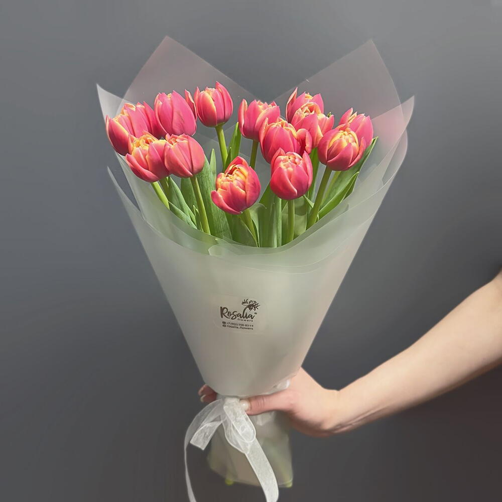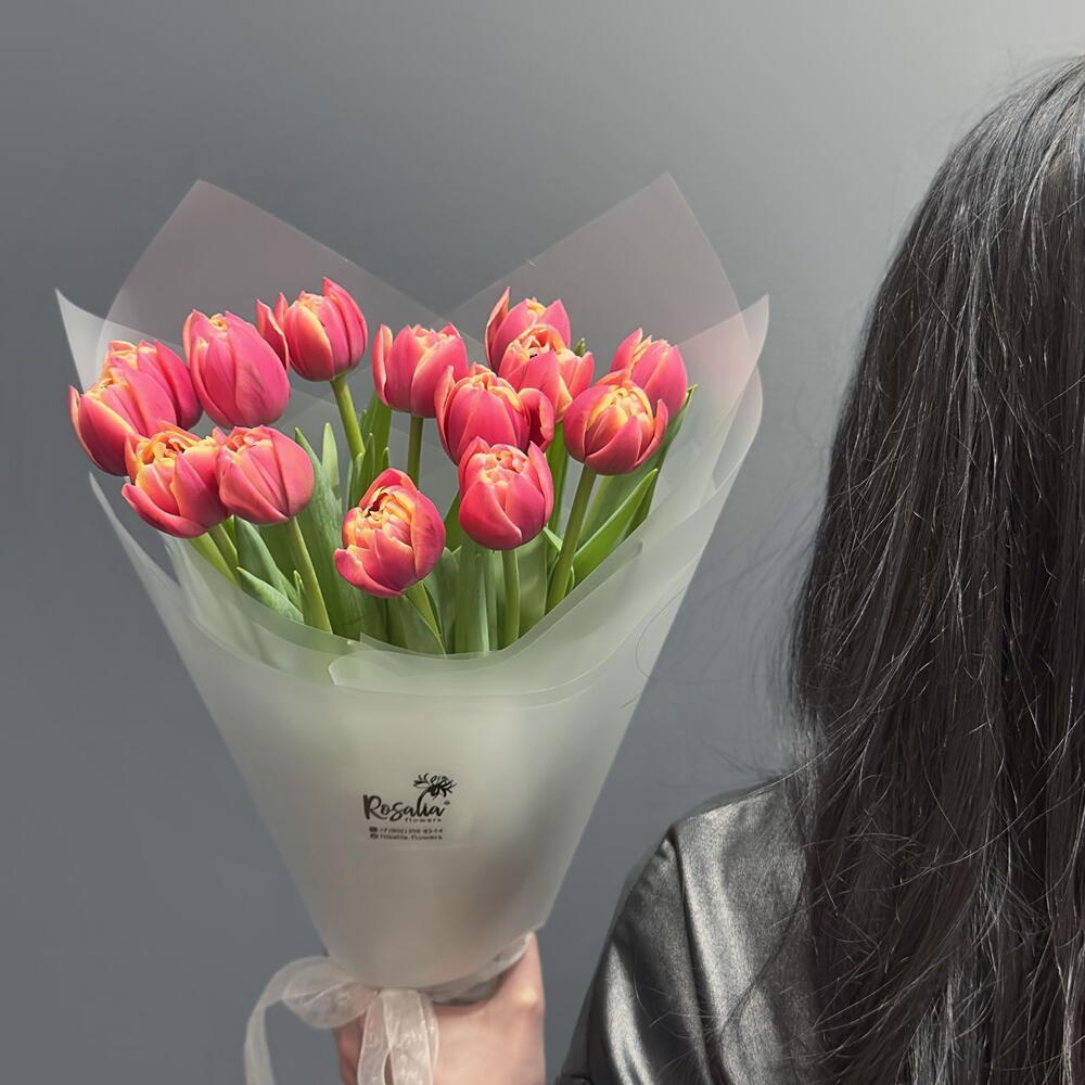 Тюльпан дабл - 15 шт. открытка фирменная - 1 шт. упаковка пленка матовая 1 м - 2 шт. аква пакет прозрачный - 1 шт. коробка для цветов №s 1 - 1 шт.