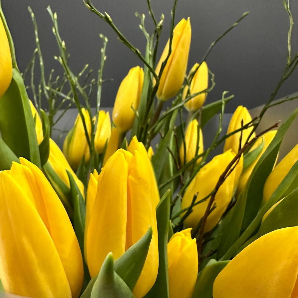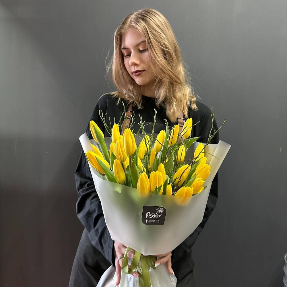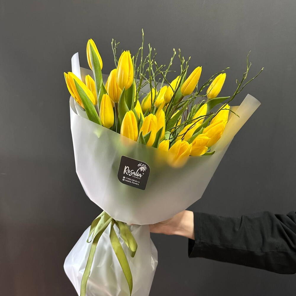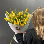 Букет из 25 желтых тюльпанов Доставляется в транспортировочной коробке Состав: тюльпаны, экзотические, упаковка пленка матовая Ширина, см: 30 Длина, см: 30 Высота, см: 50 Вес: 0.9 кг..