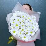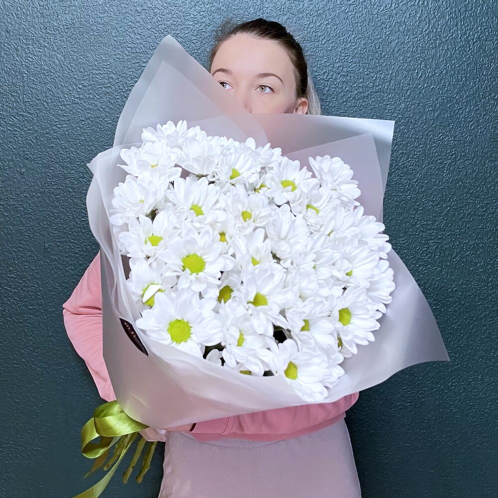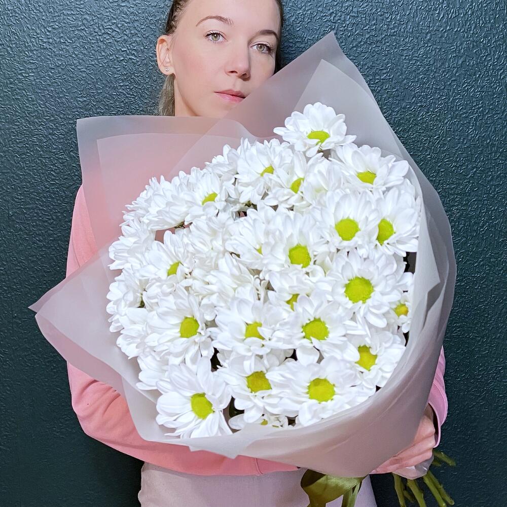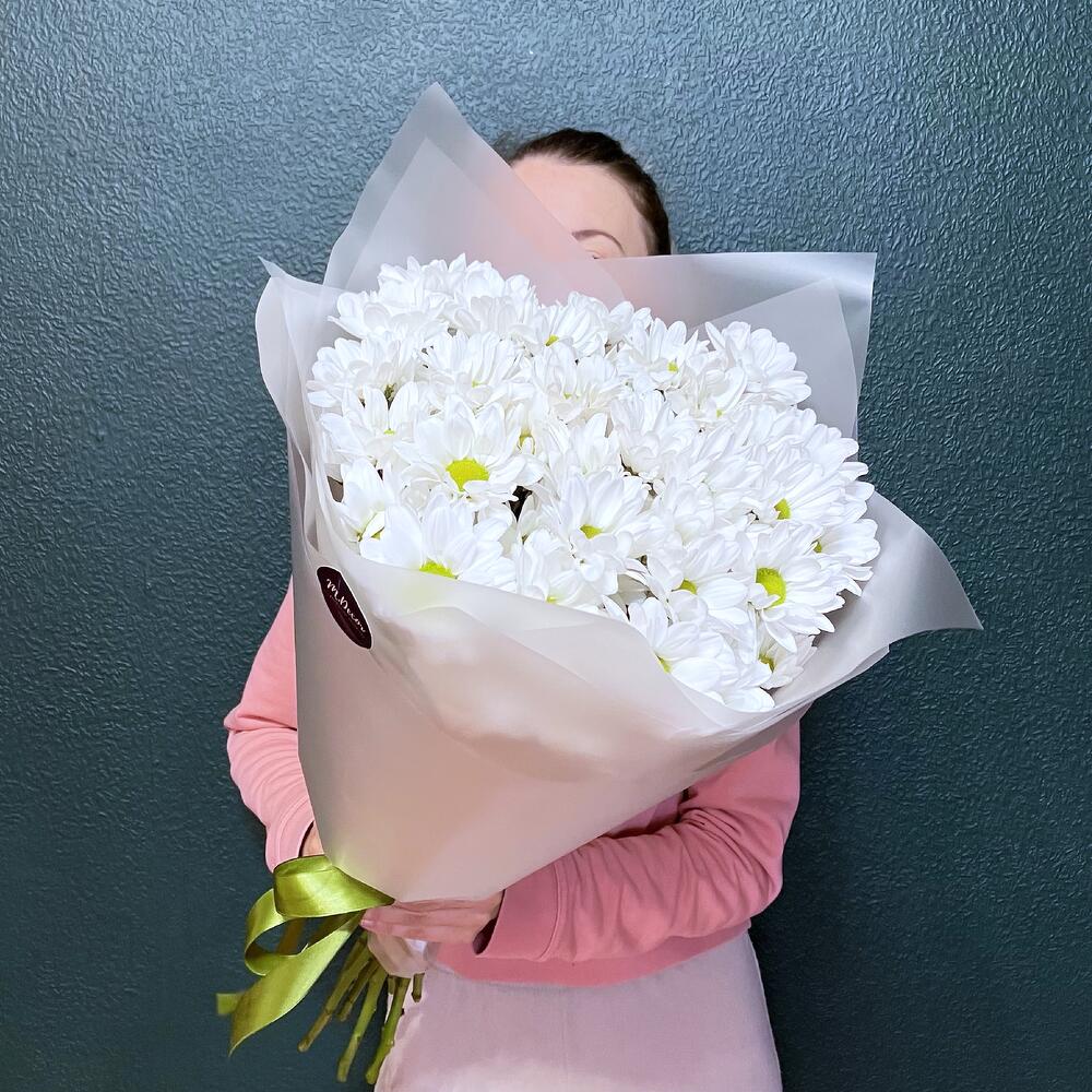 Монобукет из 9 веток белой кустовой хризантемы, упакованный в матовую плёнку.