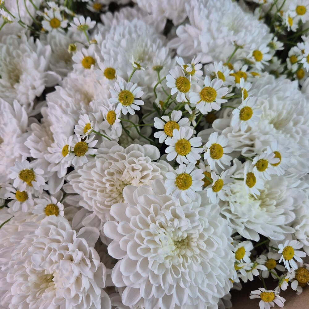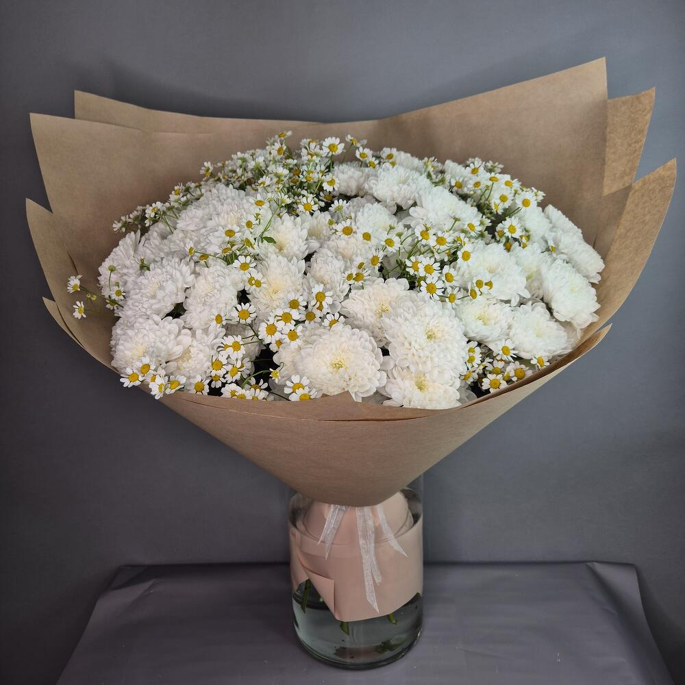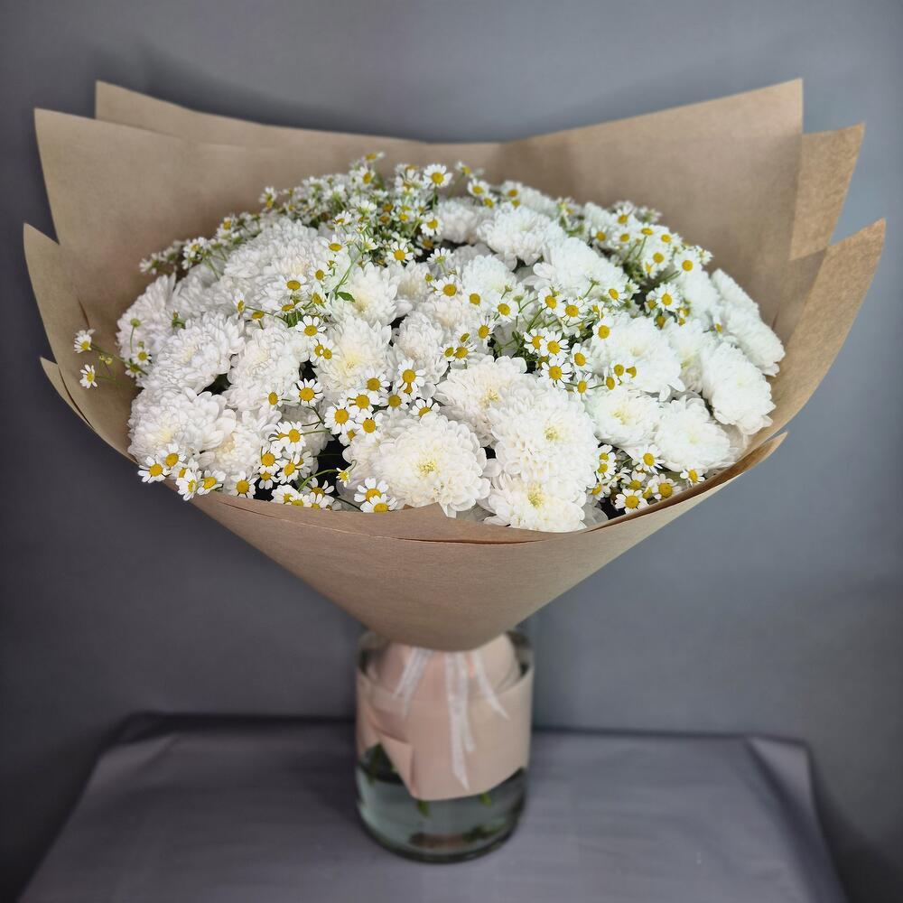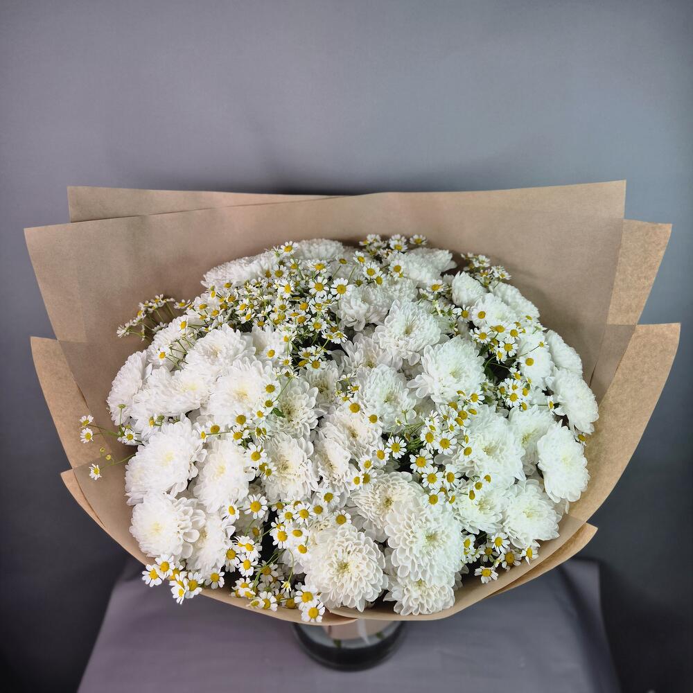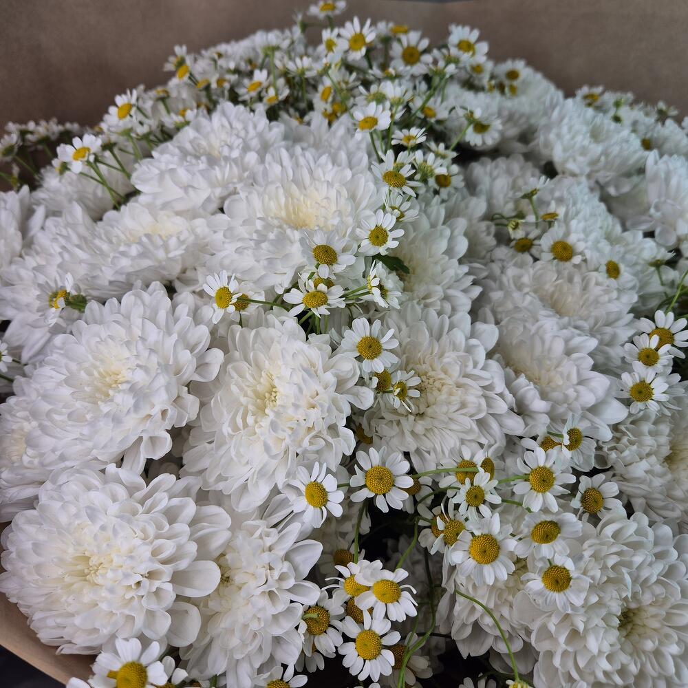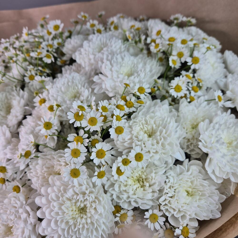Хризантема кустовая - 15 шт. Матрикария - 14 шт. Упаковка дизайнерская - 1 шт.