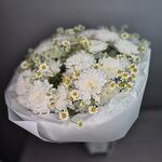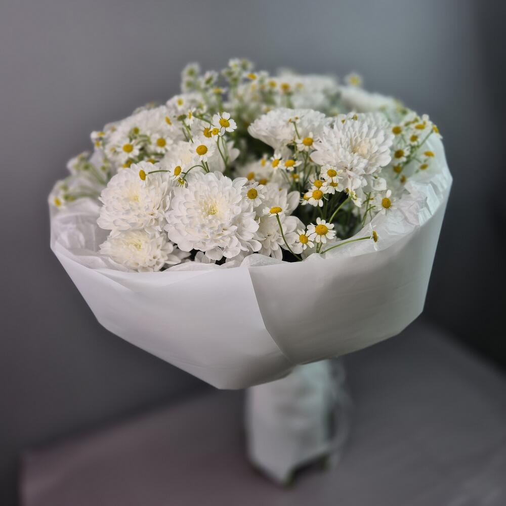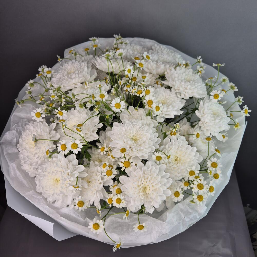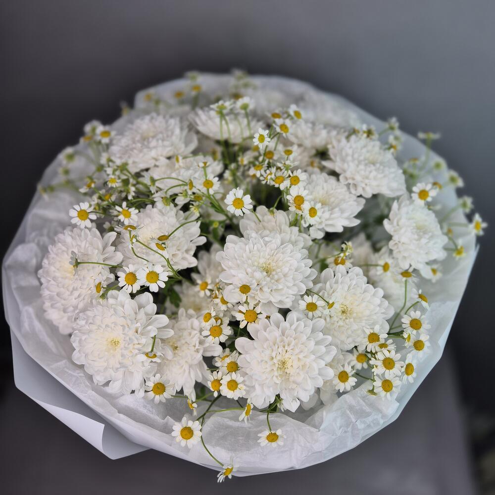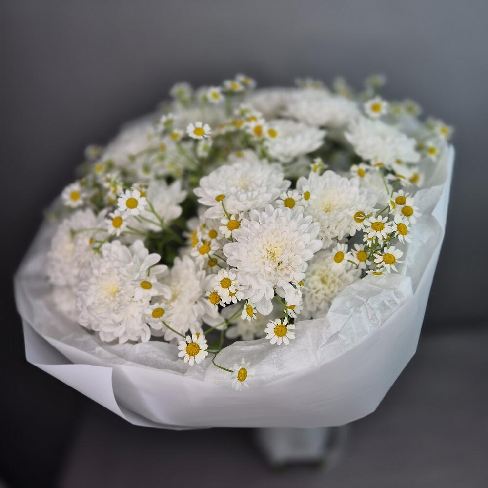 Хризантема кустовая - 5 шт. Упаковка дизайнерская - 1 шт. Матрикария (ромашка) - 8 шт.