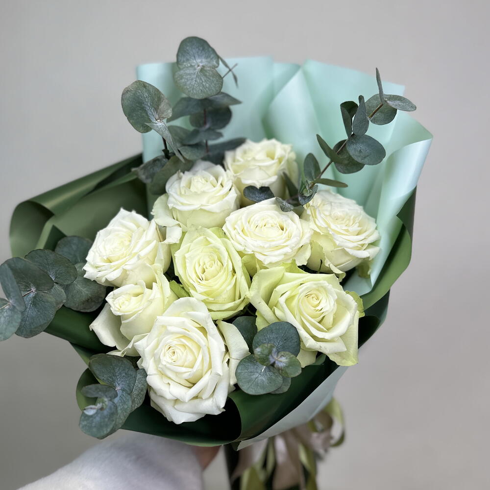 Роза белая - 9 шт. Эвкалипт Цинерея - 1 шт. Дизайнерская упаковка - 2 шт. атласный бант - 1 шт.