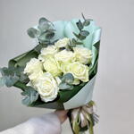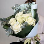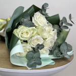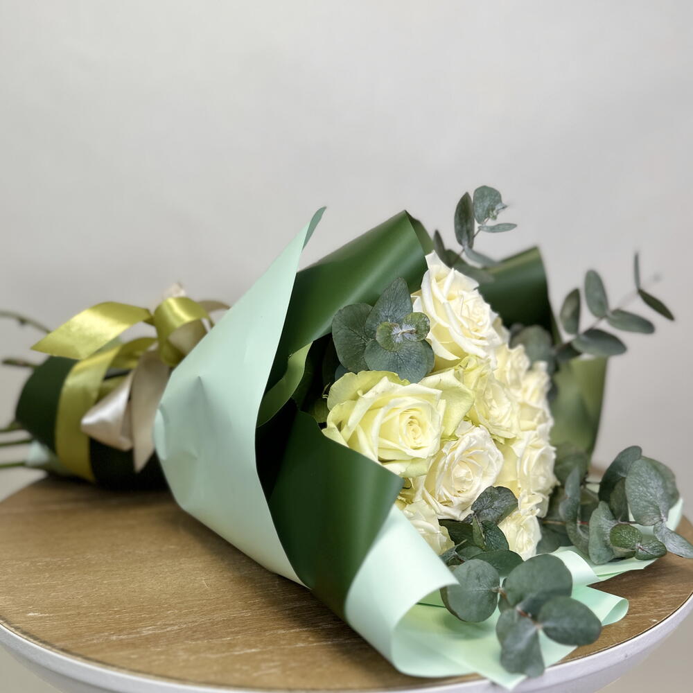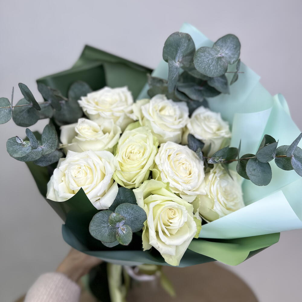 Монобукет из белых роз с ароматными веточками эвкалипта, порадует Вас и ваших близких.
