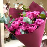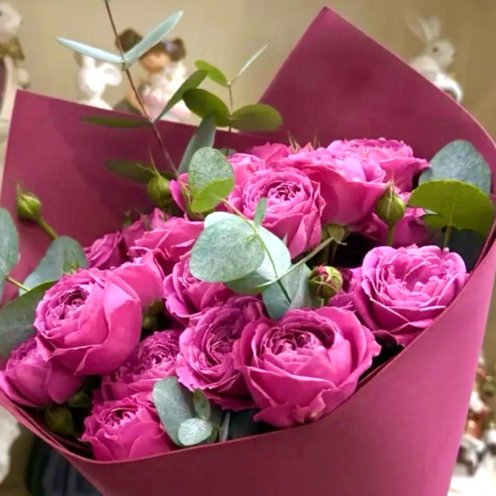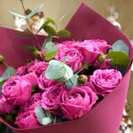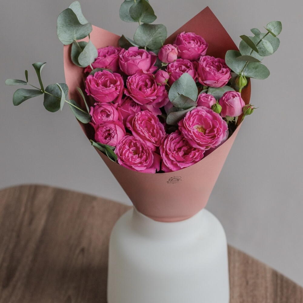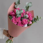 Лента атласная - 3 шт. Роза кустовая пионовидная - 3 шт. Упаковка дизайнерская - 4 шт. Эвкалипт Цинерея - 1 шт.