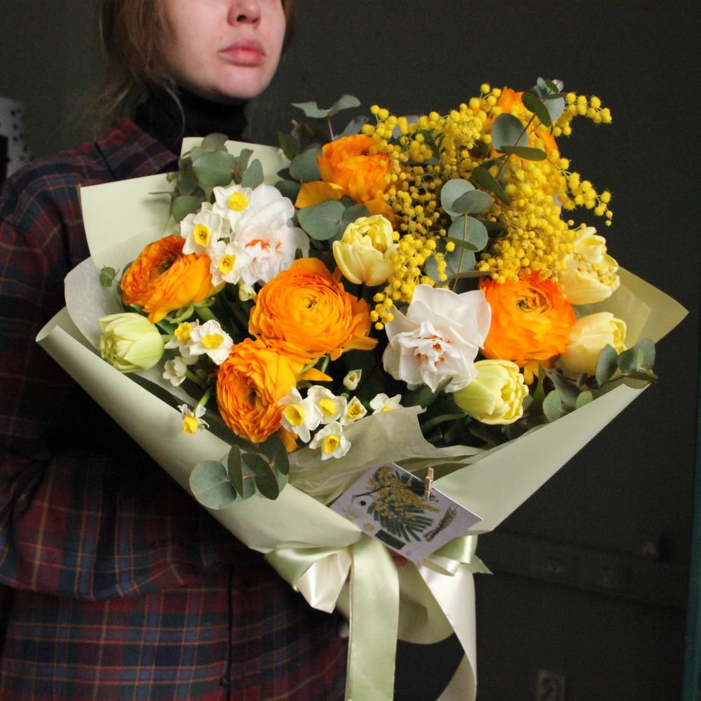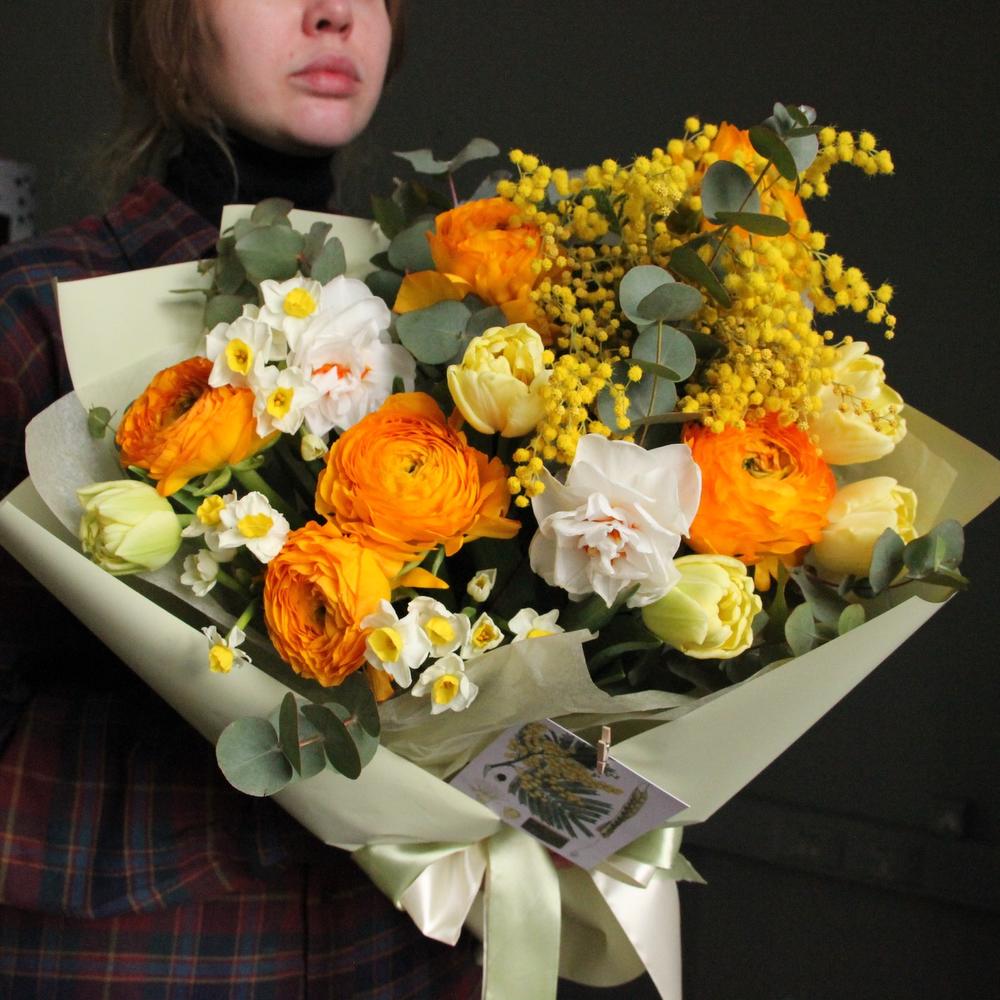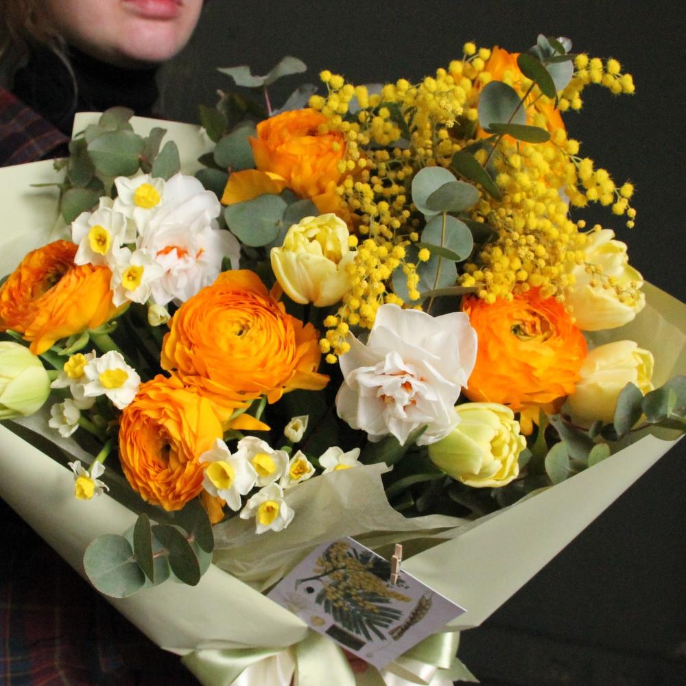 Авторский букет с нарциссами, ранункулюсами, мимозой и эвкалиптом. Приедет к получателю в подарочной коробке и на воде.