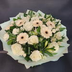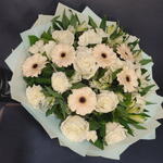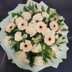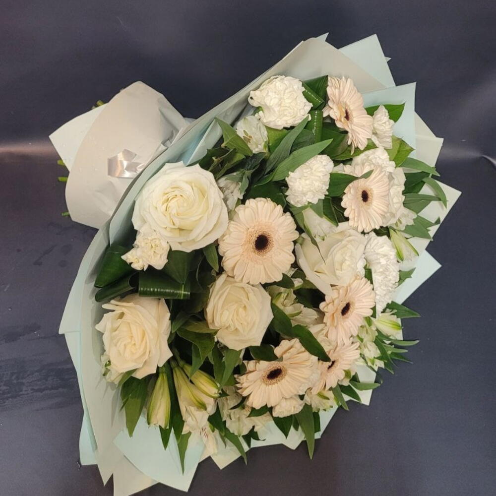 Альстромерия - 5 шт. Аспидистра - 5 шт. Гвоздика - 5 шт. Лента атласная - 1 шт. Гербера мини - 6 шт. Упаковка дизайнерская - 1 шт. Роза эквадор 50 см - 7 шт.