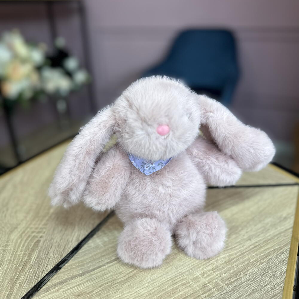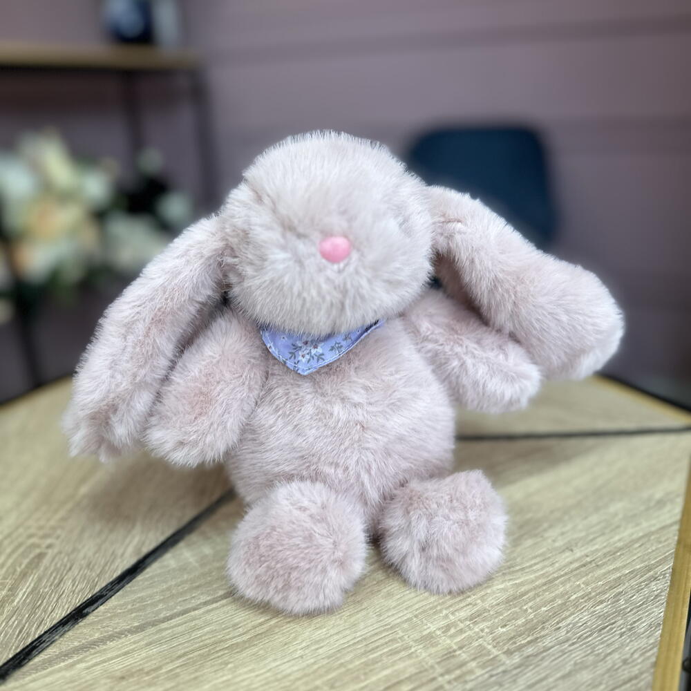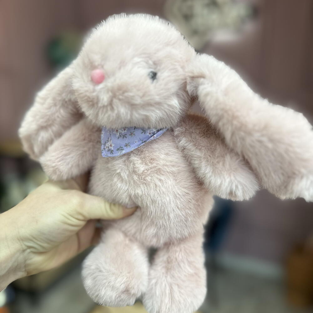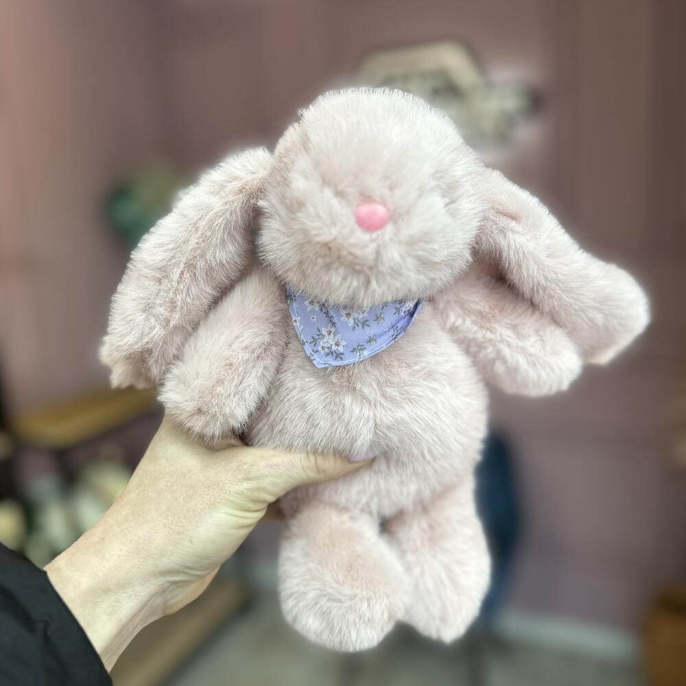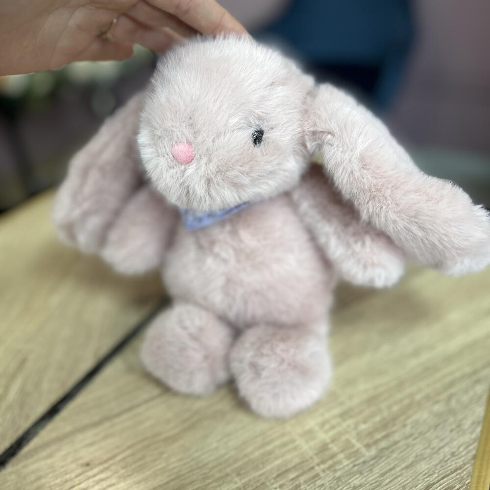 Мягкий и пушистый зайка в нежно-розовом цвете, прекрасное дополнение к букету. Так же великолепен и сам по себе, как милый комплимент. Можем подписать открыточку с вашими пожеланиями. Доставляем в крафт-пакете.