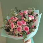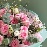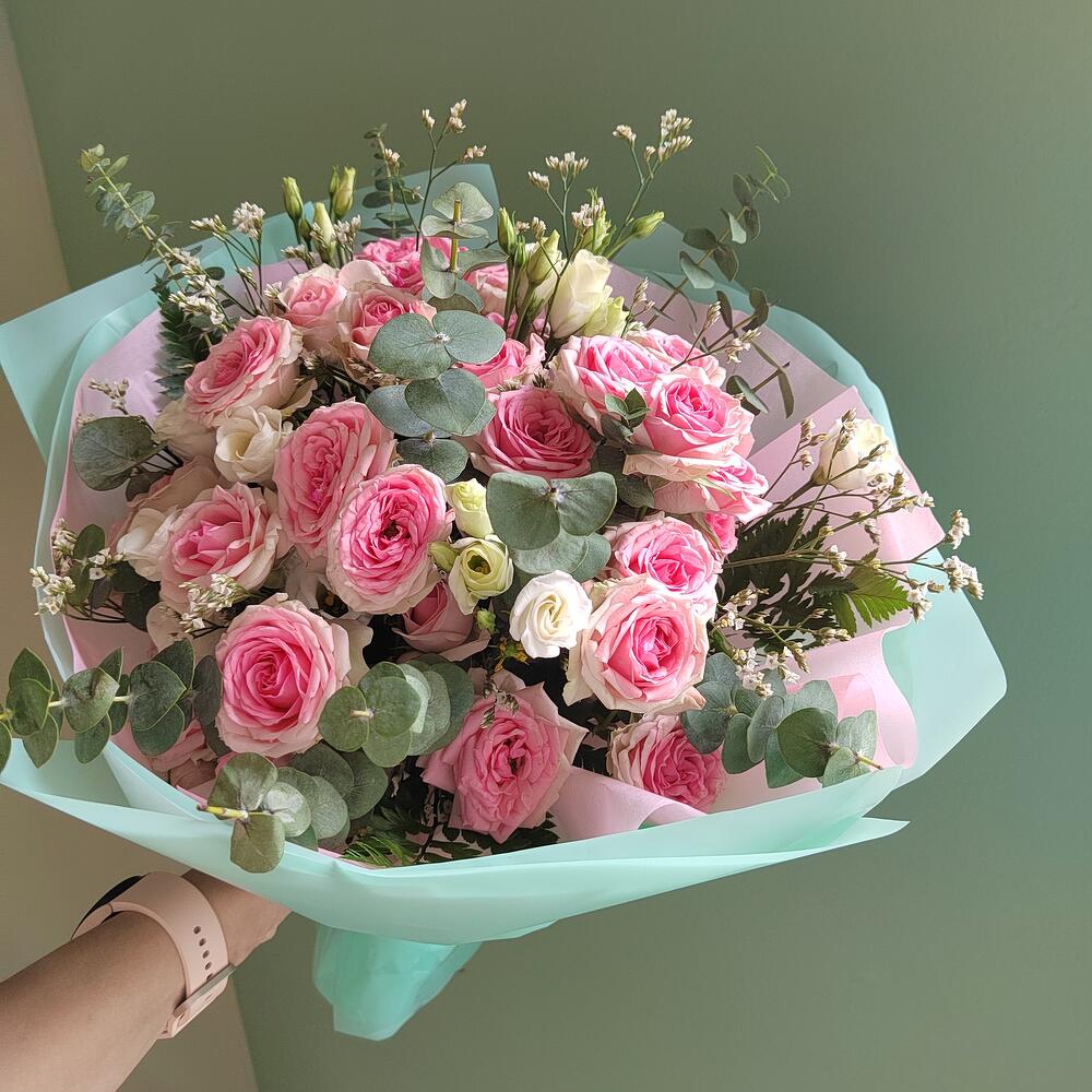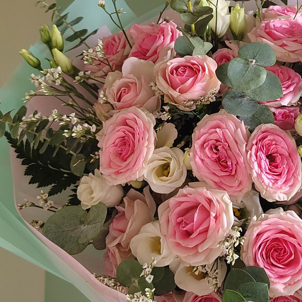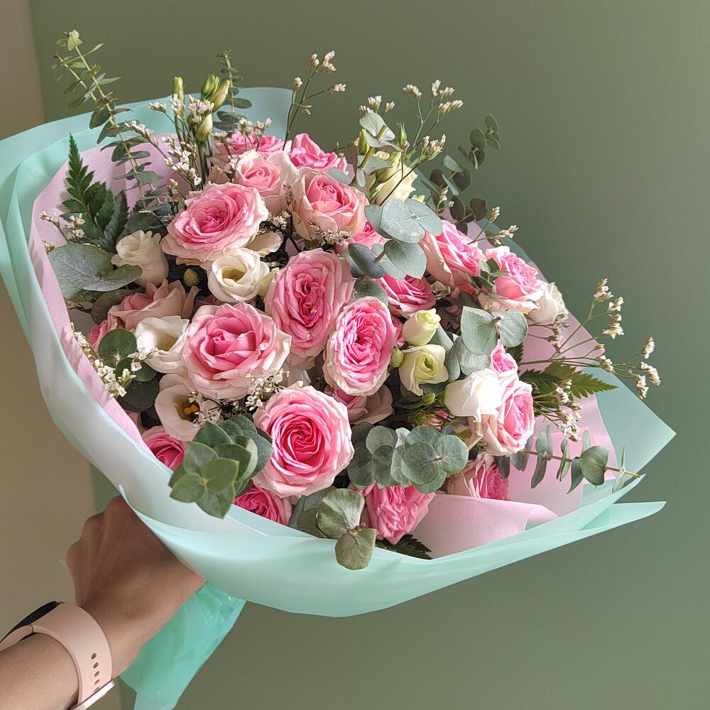 Кустовая роза , лизиантус, эвкалипт. Букет "Барби" N1 на 8 марта