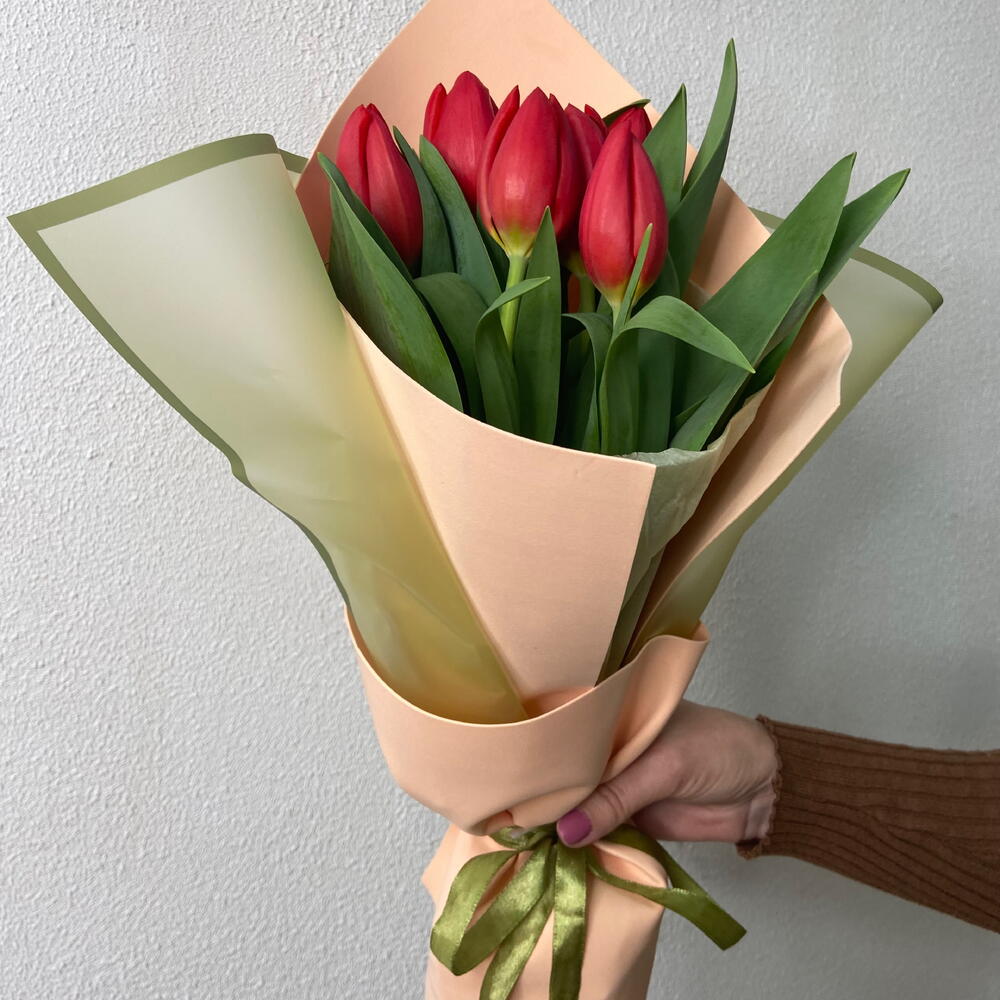 Пышный букет из ярких красных тюльпанов — воплощение страсти, искренних чувств и безупречного вкуса. Сочные алые бутоны на стройных стеблях создают выразительную композицию, которая мгновенно приковывает взгляд.