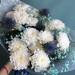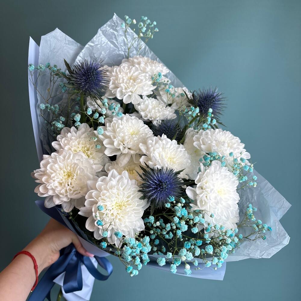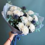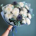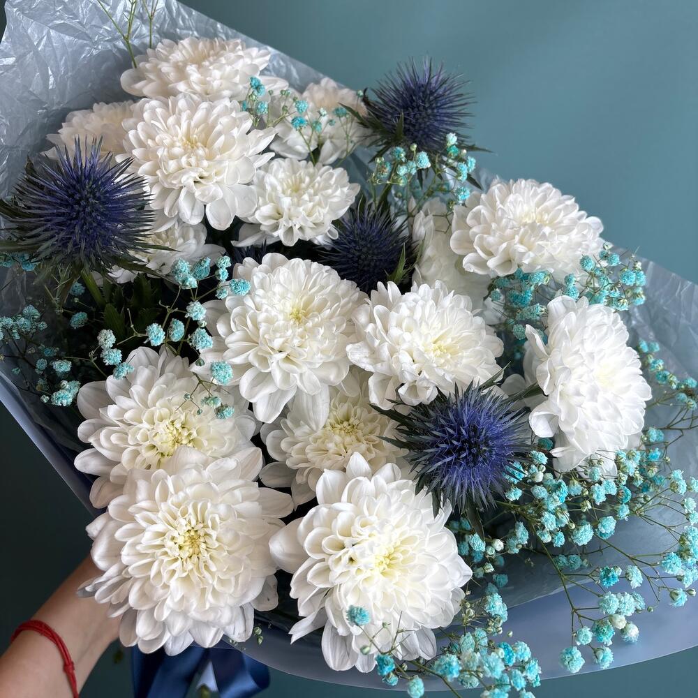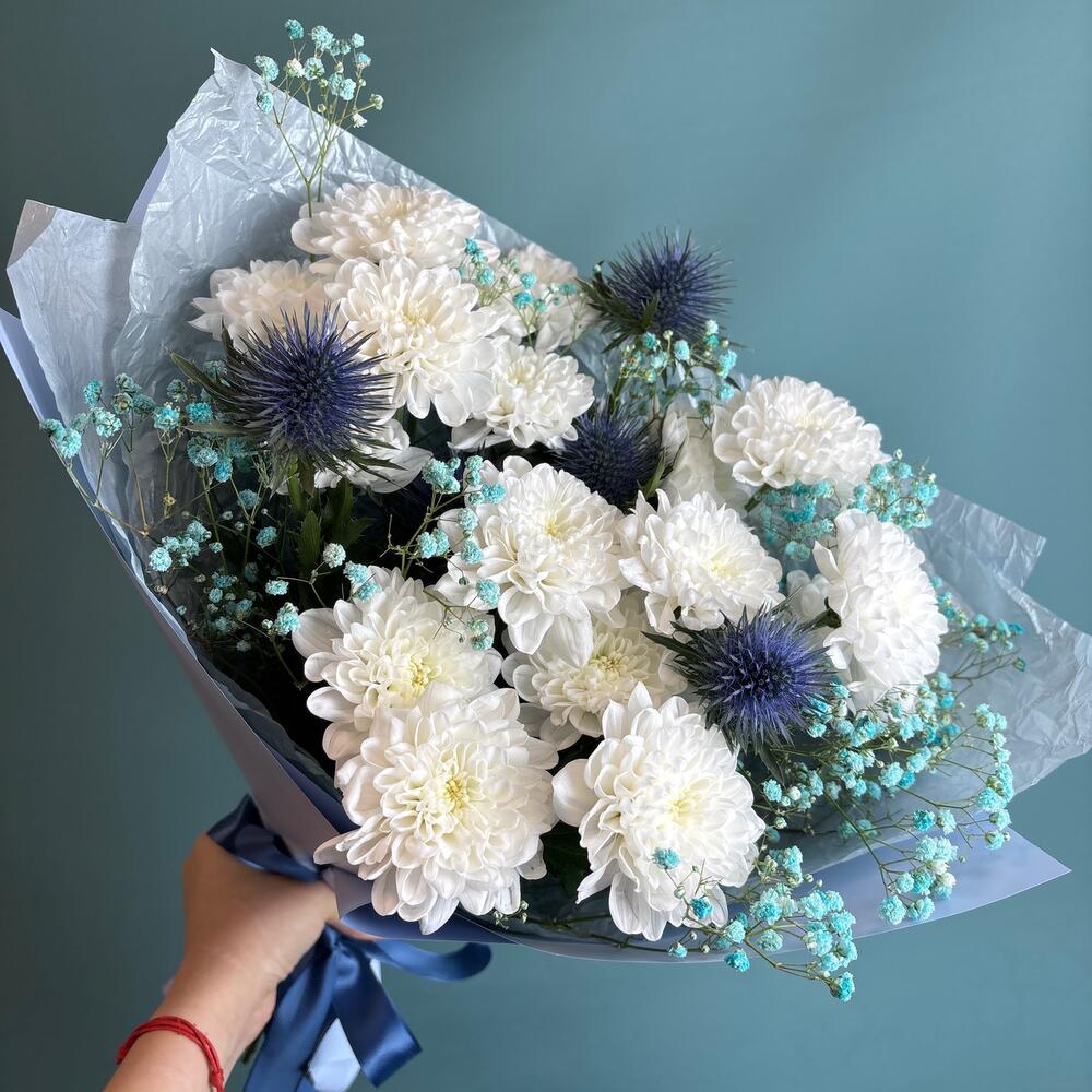 Этот изысканный букет сочетает в себе элегантность и нежность. В его основе лежат три пышные белые кустовые хризантемы Алтай, которые создают ощущение свежести и чистоты. Их дополняют кустовой эрингиум синего цвета, добавляющий композиции загадочности и глубины. Гипсофила голубая, словно легкое облако, обрамляет букет, придавая ему воздушность и легкость. Такой букет станет прекрасным подарком для близкого человека на день рождения или юбилей. Он символизирует радость, тепло и уважение. Романтическое свидание: Нежные цвета и разнообразие цветов делают этот букет идеальным для девушки Оставляем право за собой поменять цвет гипсофилы на белую