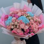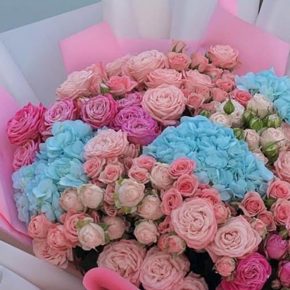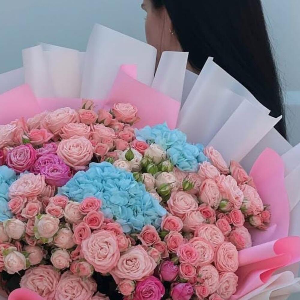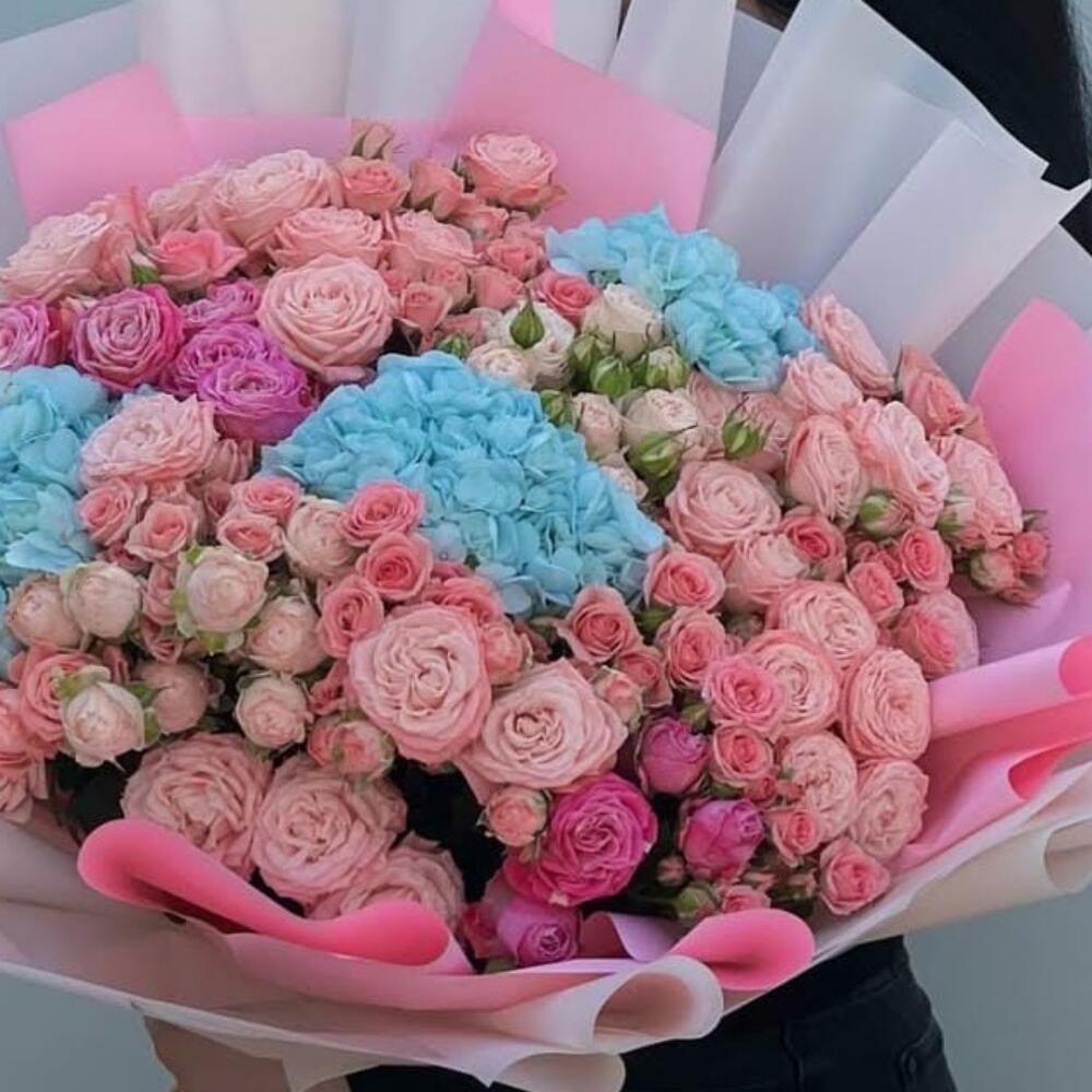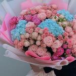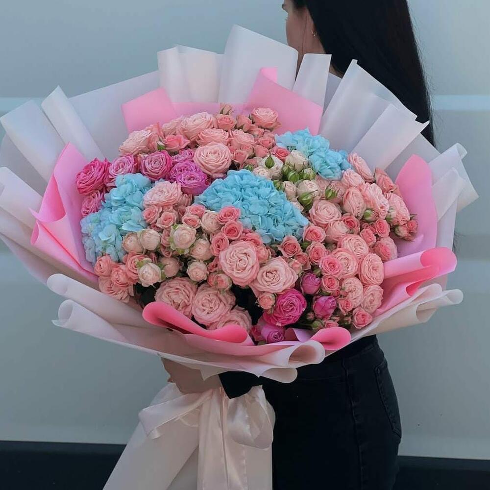 Гортензия - 3 шт. Лента атласная - 1 шт. Упаковка дизайнерская - 1 шт. Открыточка с вашими пожеланиями - 1 шт. хорошее настроение - 1000 шт. роза кустовая пачка - 1 шт. роза кустовая пионовидная пачка микс - 2 шт.